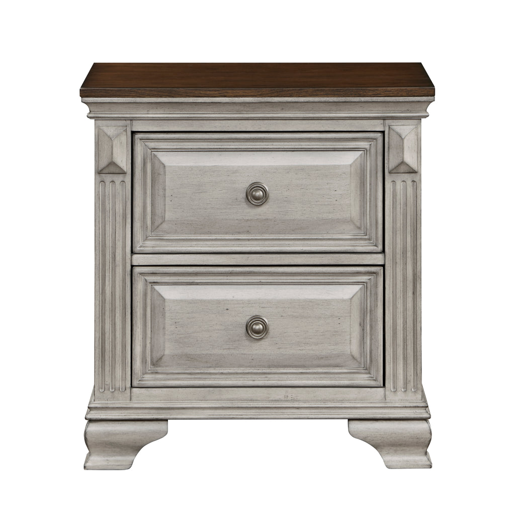 The stately presence of the Marquette Collection is steeped in traditional accenting, culminating in a refined look for your bedroom. The nightstand features frame molding, routed pilasters and a two-tone gray and brown finish over oak veneer. The drawers of the nightstand are accented with antique bronze-finished knob hardware.