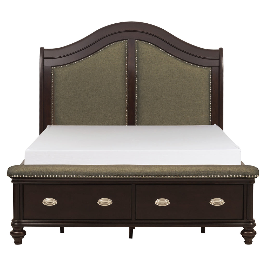 Refined elegance is exemplified in the design of the Marston Collection by the blending of classic design elements to create a warm and welcoming bedroom. This queen bed features turned feet and high polished cup pull and knob hardware as well as neutral toned fabric inserts on the headboard and padded footboard rail featuring nailhead accent. Drawer storage features prominently on the footboard, offering that extra functional space that you need. The classic dark cherry finish further lends to the modern traditional look of the Marston Collection. 67 x 98 x 60H