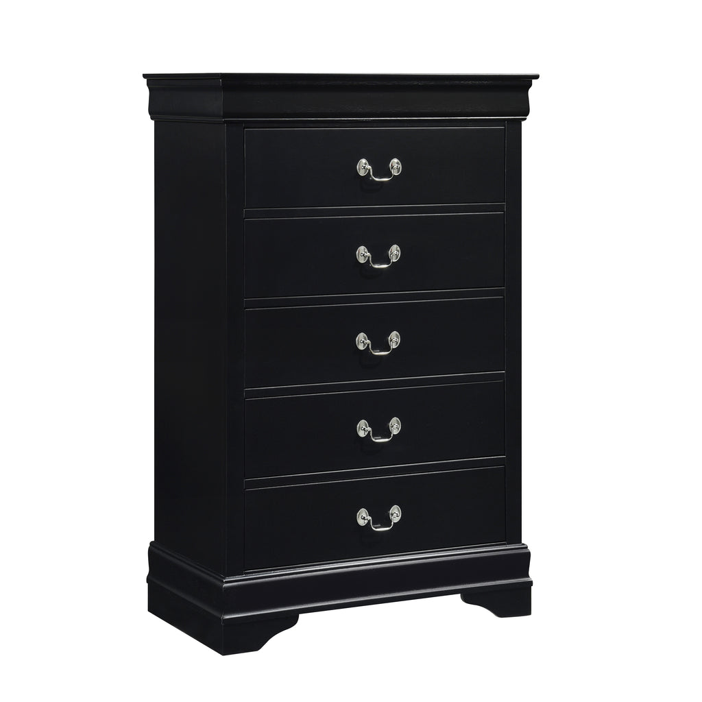Traditional in design and modest in scale, the elegant Mayville Collection takes its design inspiration from the classic Louis Philippe styling. The Okume veneer of the chest is paired with a black finish and is accentuated by antique nickel tone drop handles.