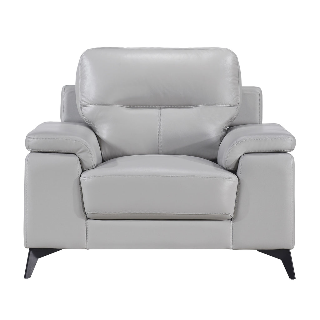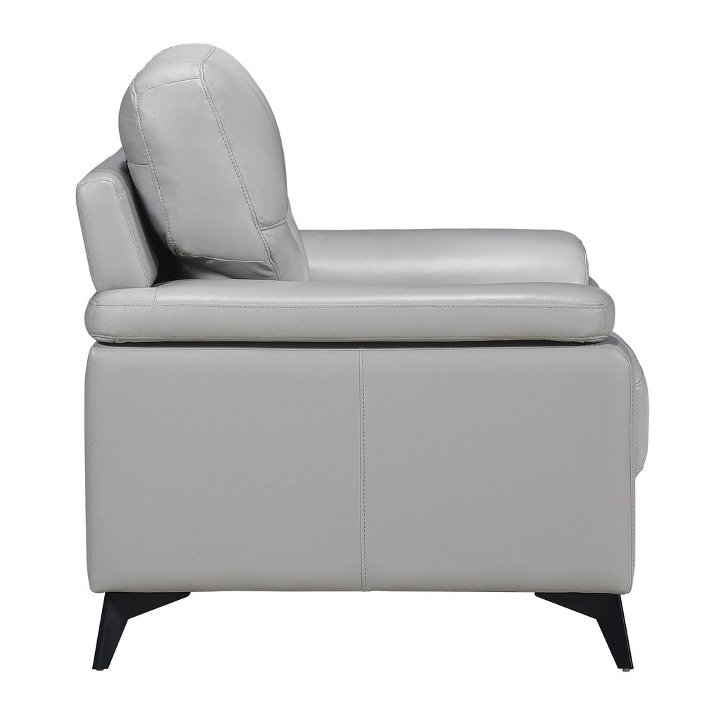 Styled for the modern home, the Mischa Collection’s chair blends the luxurious feel of leather with the comfort of plush seating. The silver top grain leather cover, with faux leather, enhances the sleek profile of the collection. Contoured pillow-top arms and black metal legs further enhance the modern stance. Coordinating sofa and love seat are available as well as an optional dark gray top grain leather cover with faux leather match.