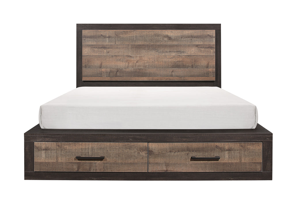 The Miter Collection combines the clean lines of contemporary styling with the look of natural wood grain in this stylish bed. The queen’s embossed faux-wood veneer is utilized in both mahogany and ebony to achieve a 2-tone contrasted finish. Antique brass tone hardware provides additional contrast to the printed wood grain. Drawers are featured on the footboard creating extra storage space. 67 x 91.5 x 47.25H