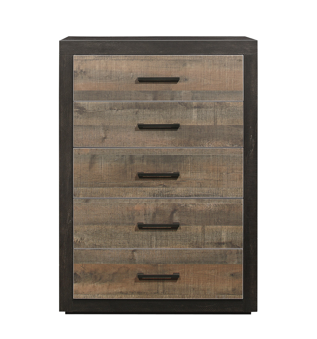 The Miter Collection combines the clean lines of contemporary styling with the look of natural wood grain in this stylish chest. The dresser’s embossed faux-wood veneer is utilized in both mahogany and ebony to achieve a 2-tone contrasted finish. Antique brass tone hardware provides additional contrast to the printed wood grain. 36 x 18 x 50.25H