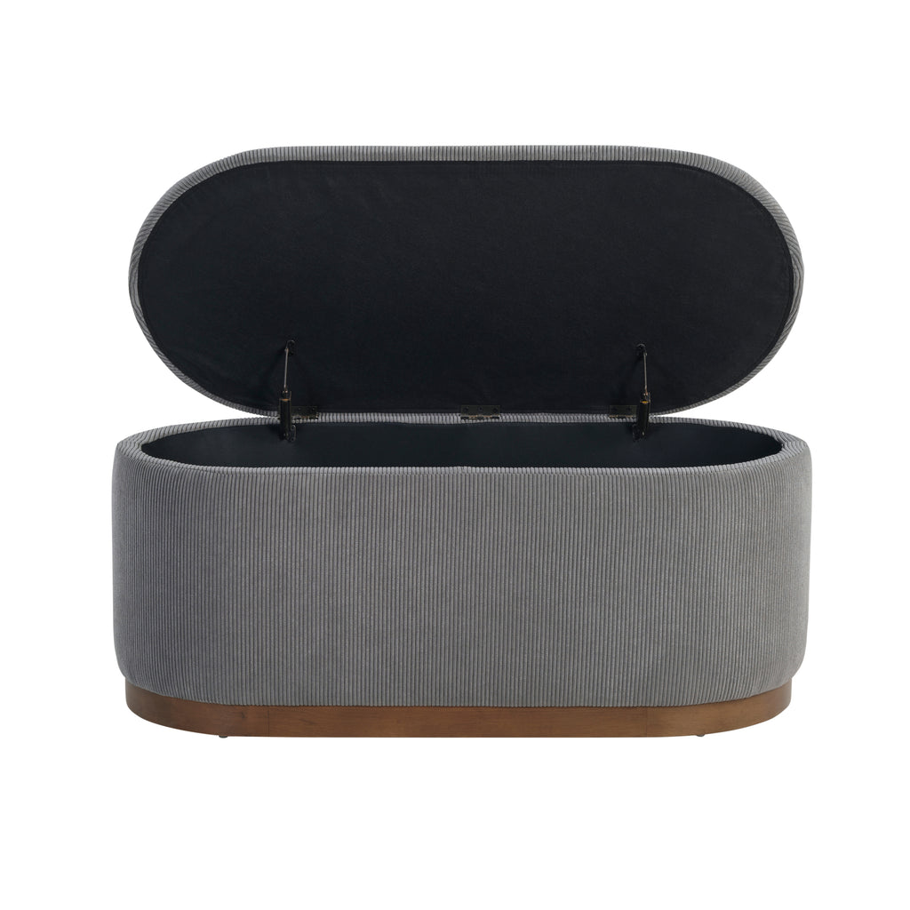 Add a touch of mid-century modern style and practical storage to your home with this gray corduroy storage bench. Featuring a sturdy plywood frame, foam-cushioned seat, and soft corduroy fabric upholstery, this bench offers both comfort and style. The solid wood legs in a rich walnut finish add a touch of warmth and elegance, while the interior storage compartment provides a convenient place to declutter your space. Perfect for entryways, bedrooms, or living rooms, this storage bench is a versatile and chic addition to any home.