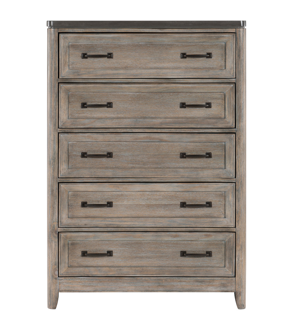 The Newell Collection’s subtle rustic aesthetic and transitional style pairs effortlessly with your desire to refresh your bedroom’s current look. The design of the chest’s drawer fronts features recessed picture frame molding while dark-finished metal bar hardware accents each drawer front, creating perfect contrasting complement to the two-tone gray and oak finish of the piece’s oak veneer.