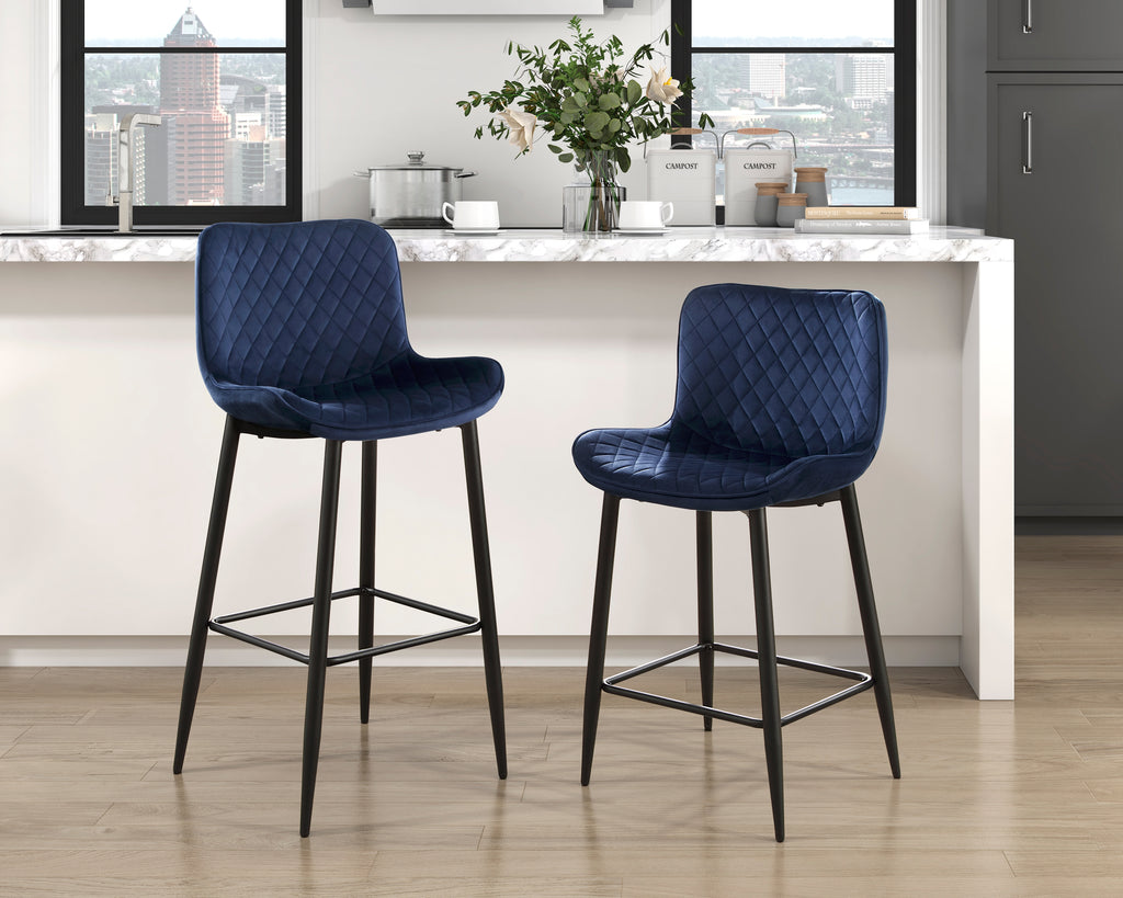 Serving as the perfect complement to your modern casual dining space, the Nya Collection pairs with your existing counter or bar tabletop. The available 29-inch height chair features a seat which is covered in dark blue velvet fabric upholstery and is supported by black metal legs. The diamond stitch pattern of the seat further lends to the modern aesthetic of the piece.