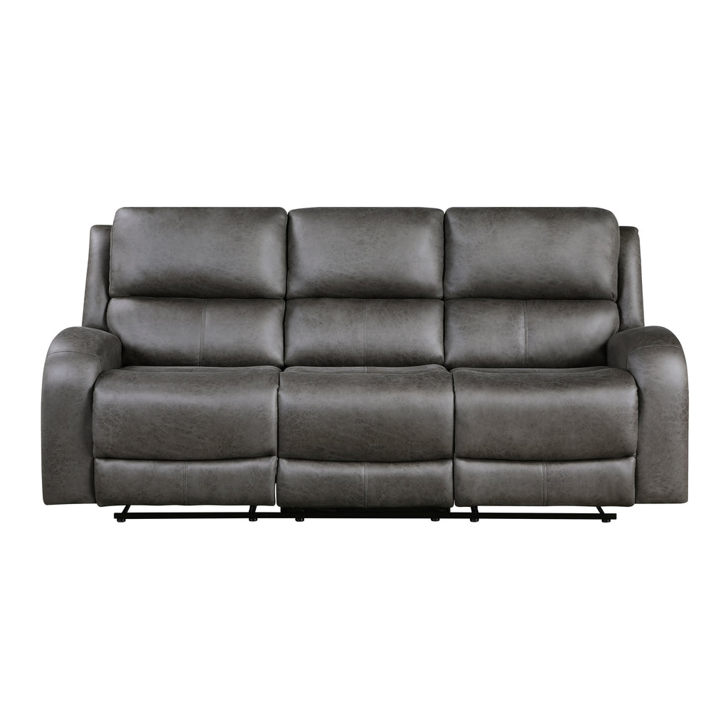 Transitional style is exemplified in the Pagosa Collection, its design pairing plush contoured seating, and versatility of style to create a relaxing space within your home’s living room. The plush contoured profile of the collection is covered in brown polished microfiber. With a pull of the side mounted tabs the dual end reclining mechanisms are engaged easing the sofa into the prone position.