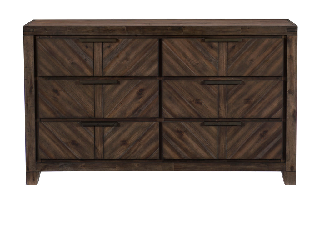 Inspired by the aesthetic of modern-rustic design, the Parnell Collection utilized bold enhancement to create the perfect addition to your bedroom. V-matched planks draw immediate attention to their visually stunning shape and distressed espresso finish, over acacia veneers, that graces the collection. Mounted at the top of each dresser drawer are antiqued finished pull hardware which enhance the rustic vision. Bold, yet understated, framing defines the collection’s modern profile.
