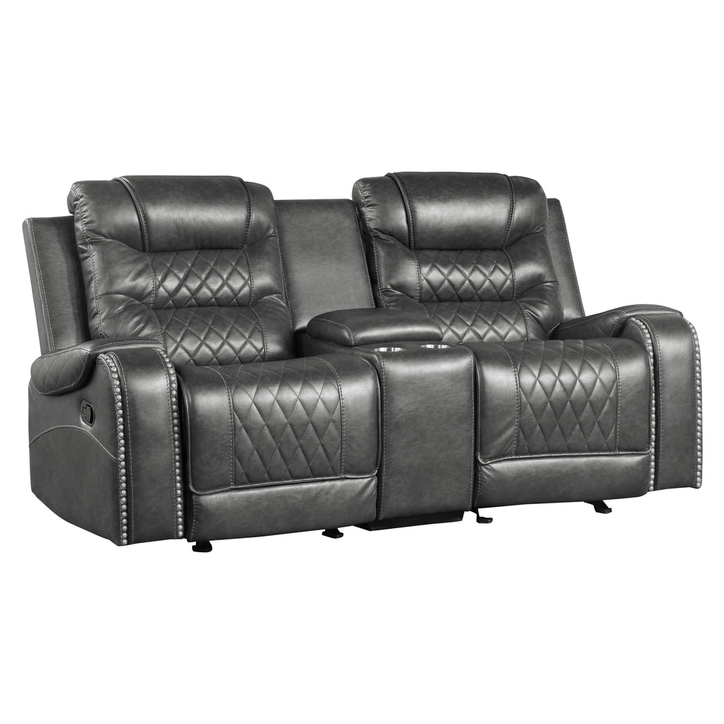 The Putnam Collection will serve as a functional, stylish, and comfortable seating group for your living room. The glider love seat features manual reclining mechanisms allowing for perfect placement and function within your available space. The glider love seat’s console features cupholders and storage space. The Putnam Collection is offered in brown breathable faux leather upholstery with diamond pattern stitching with nailhead-adorned arms for classic decorative effect.