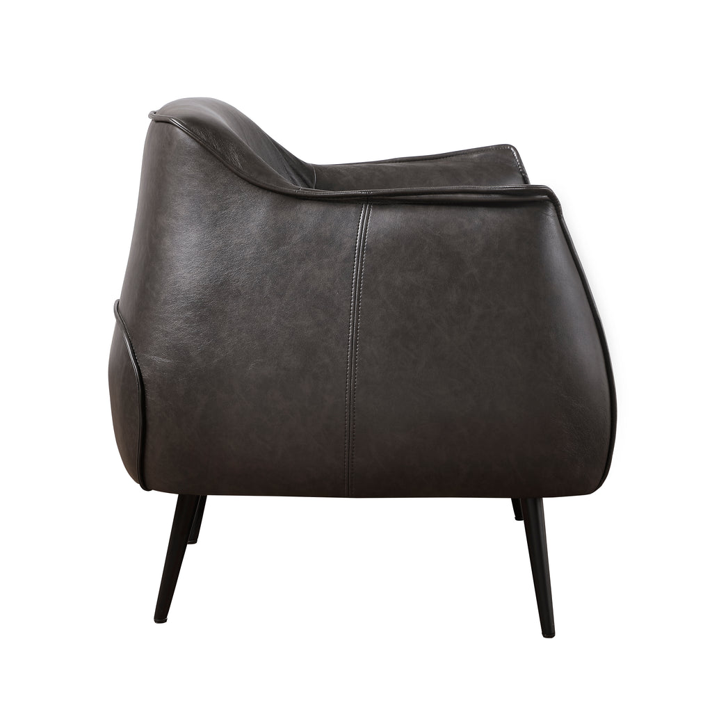 Shining like a Hollywood star, the Rachael Collection is a gorgeous pairing of lines, texture, and color, a perfect combination to reflect your home’s modern look. Brown premium faux leather upholstery covers the knife-edge lines of this elegant accent chair while black finished metal stiletto legs provide support. The enveloping seatback wraps the contour of the seat, rising to the arm’s subtly flared profile.