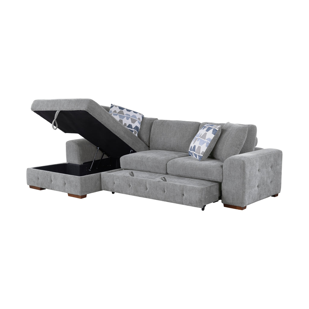 The substantial seating space of the Raife Collection creates a comfortable spot perfect for entertaining or just relaxing. The configuration consists of a left-side chaise which is paired with a right-side two-seater – with pull out bed and one centimeter of memory foam on the seats. The pull-out bed that is stored beneath the right-side two-seat unit, pops up to create ample space for full leg extension. The lift-top seat of the chaises opens to reveal hidden storage perfect for blankets and pillows. Gray chenille fabric upholstery covers the seating group. 115 x 67 x 35H