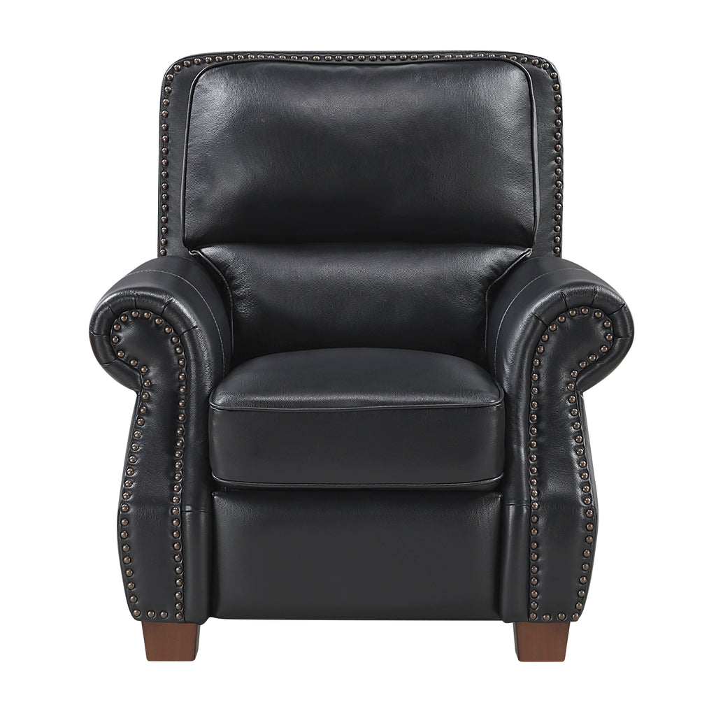 Experience timeless luxury and customizable comfort with this traditional, roll arm push back reclining chair, upholstered in genuine top grain leather where you touch. Constructed for durability, it features a robust solid wood and plywood frame with a metal-reinforced seat, supporting a weight capacity of 300lbs. The seating provides excellent support with foam padding over pocket coils, while the classic nailhead trim and rich solid wood feet in a brown finish add a refined, handsome touch to any living room, library, or study. Simply lean back to engage the easy push-back/self-reclining motion and find your perfect angle for relaxation.