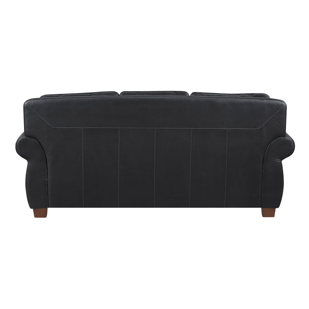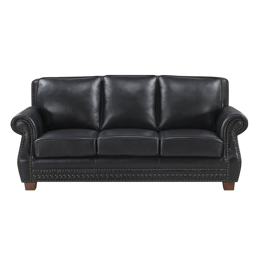 Maximize the sophisticated appeal of your living room with this luxurious sofa, upholstered in genuine top grain leather where the body touches for a premium feel. Built on a sturdy plywood frame and designed for lasting comfort, this sofa features a strong 300lbs weight capacity per seat. The seating is plush yet supportive, utilizing foam padding over pocket coils. Classic design details abound, including elegant nailhead trim along the base and rolled arms, and the piece rests on rich solid wood feet in a brown finish, making it a distinguished and durable centerpiece for any space.