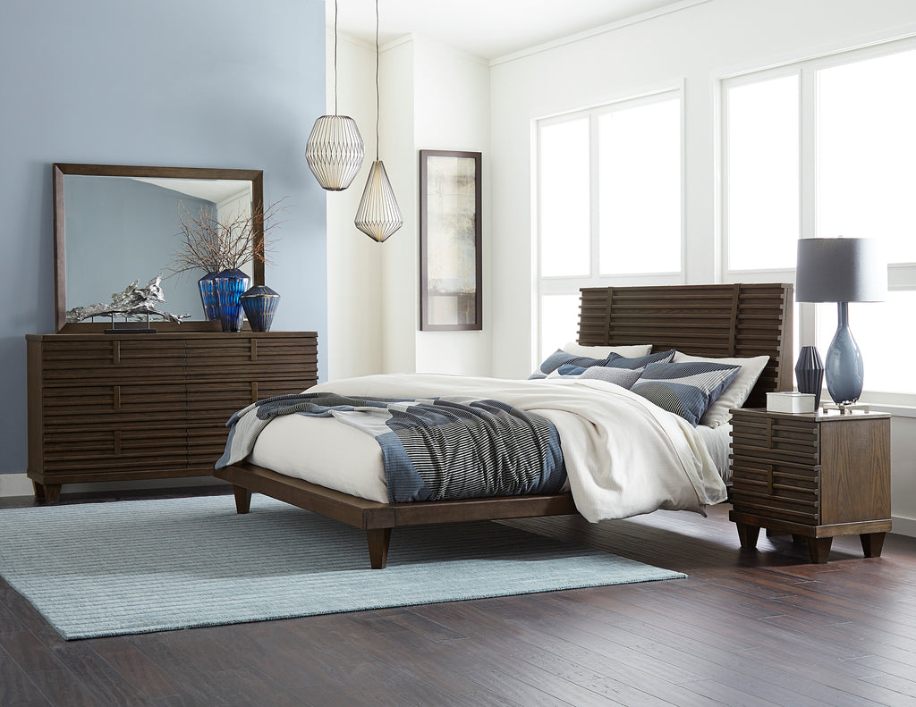 Dramatically designed for maximum eye-catching appeal, the rustic-contemporary Ridgewood Collection blends angles, planes and natural elements to achieve a beautiful composition of style. The solid poplar raised slats that grace every piece of this collection are interrupted by the inset vertical metal headboard accent and drawer pulls. Oak veneer is utilized and highlighted by a rustic burnished oak finish. The final touch that creates contrast to the bold horizontal lines are the supporting feet designed with a 45-degree angle. This study in geometric-inspired design will be a unique addition to your bedroom.