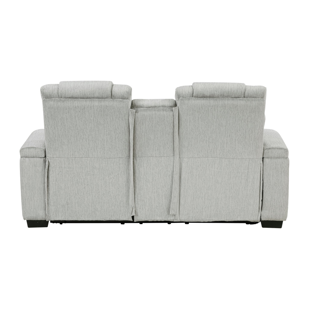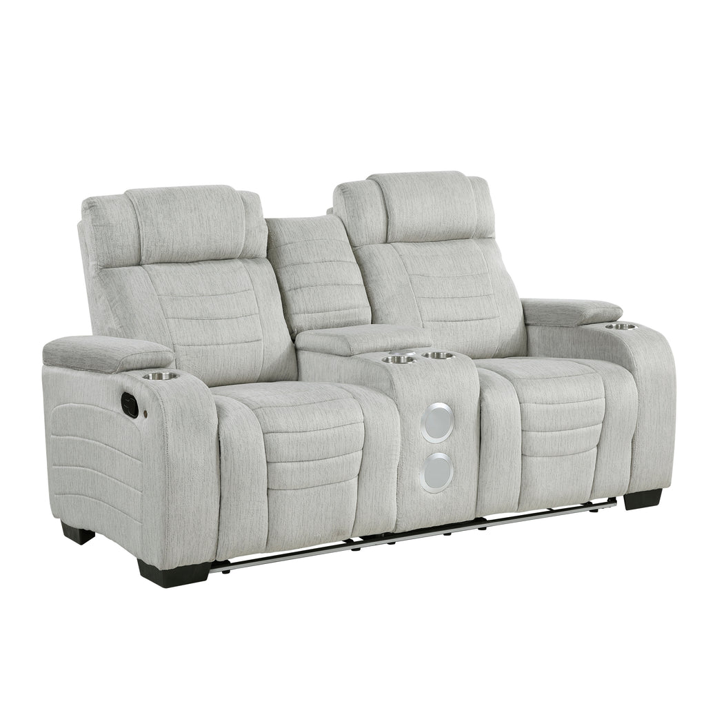 Transform your living space into a home theater with the reclining loveseat, designed for shared relaxation and entertainment. Upholstered in a soft yet durable textured microfiber, this loveseat offers a comfortable and stylish centerpiece for any room. Enjoy individual reclining comfort with the easy-to-use tab pull motion, while keeping drinks and remotes close at hand with the integrated cup holders and hidden armrest storage. The added convenience of a center console with wireless speakers allows you to immerse yourselves in your favorite movies or music. Enhancing the ambiance, subtle LED lighting along the base creates a modern and inviting atmosphere. Built with a sturdy solid wood and plywood frame featuring metal-reinforced seats, this loveseat ensures lasting durability and supports up to 300lbs per seat, making it the perfect blend of comfort, convenience, and style for you and a loved one.