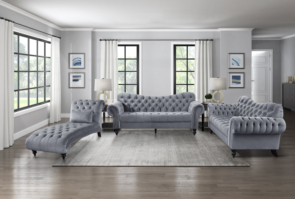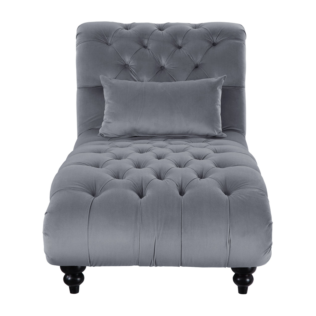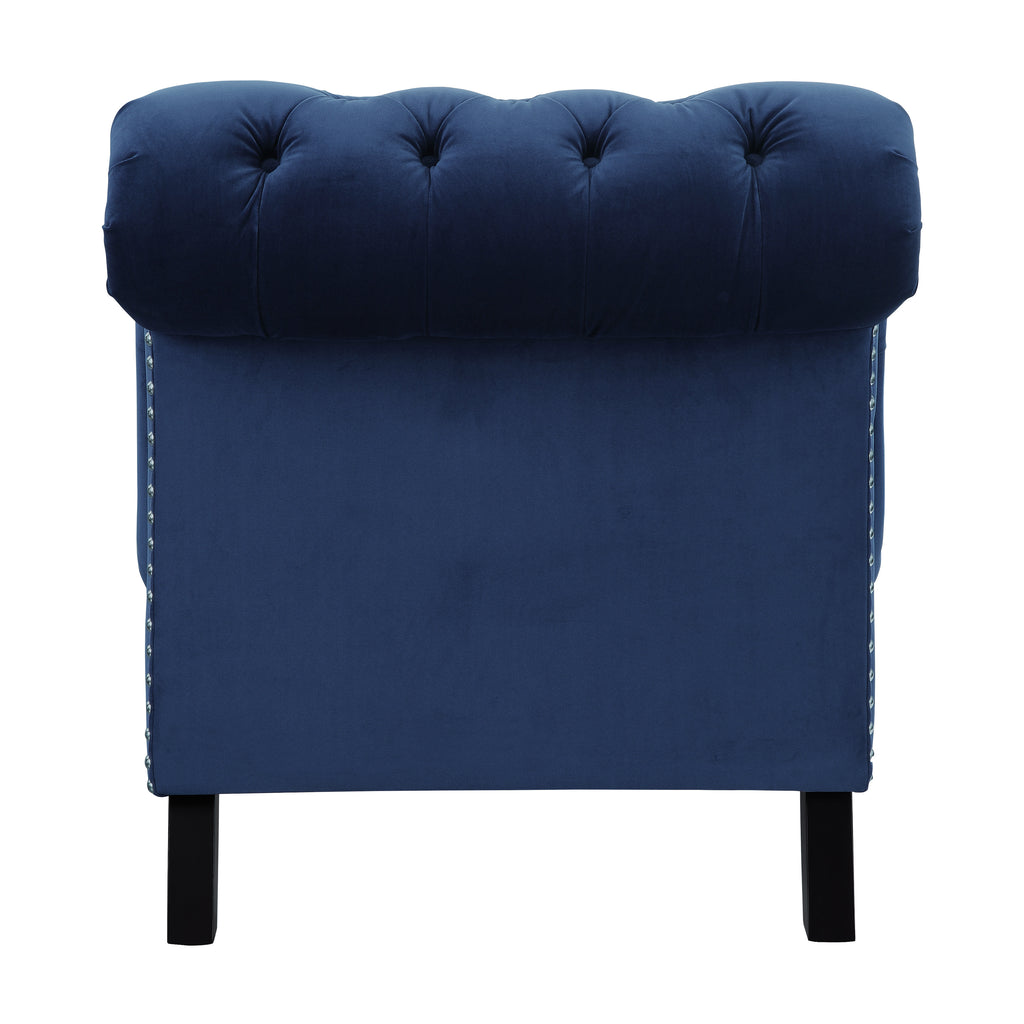 The exquisite glamour that accents your home will pair perfectly with the Rosalie Collection. The dramatic curves of the chaise give way to traditional accent in the form of rolled arms, button-tufting, turned legs -with black finish- and nailhead trim. The velvet covering of the collection is offered in navy to perfectly complement your living space.