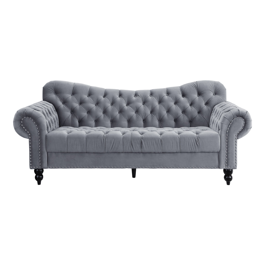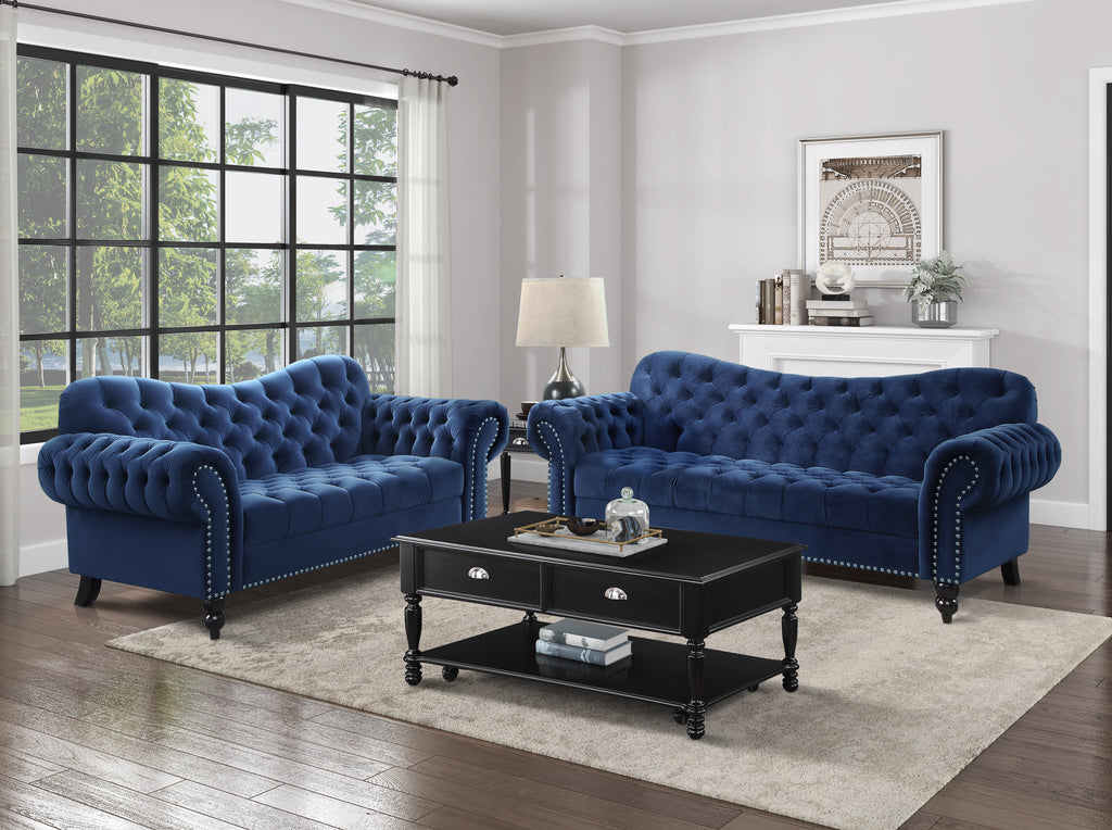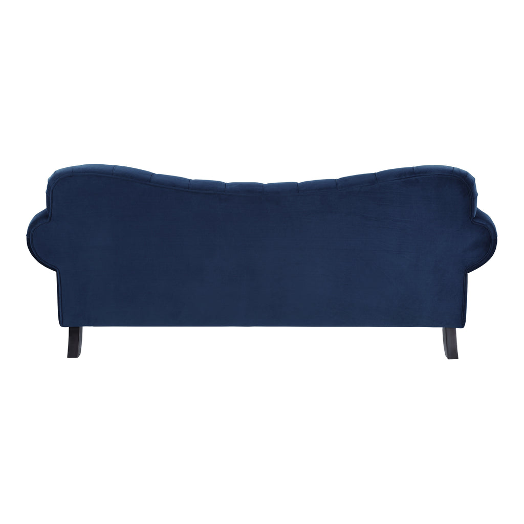 The exquisite glamour that accents your home will pair perfectly with the Rosalie Collection. The dramatic curves of the sofa give way to traditional accent in the form of rolled arms, button-tufting, turned legs -with black finish- and nailhead trim. The velvet covering of the collection is offered in navy to perfectly complement your living space.