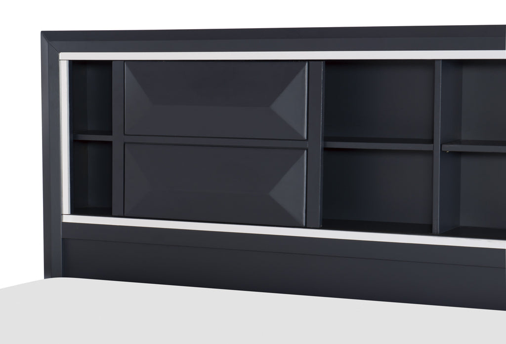The modern design of the Rosemont Collection creates a striking profile for your bedroom. The midnight blue finish is reflected by the chrome banding that defines the front of the queen bed. The hidden bookcase headboard and storage footboard proved additional functional storage space beyond a traditional case piece. Chrome pull hardware accents each of the raised drawer fronts. 63 x 92 x 53H