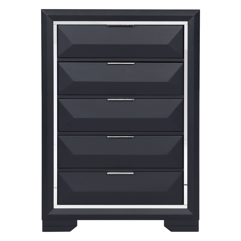 The modern design of the Rosemont Collection creates a striking profile for your bedroom. The midnight blue finish is reflected by the chrome banding that defines the front of the chest. Chrome pull hardware accents each of the raised drawer fronts.