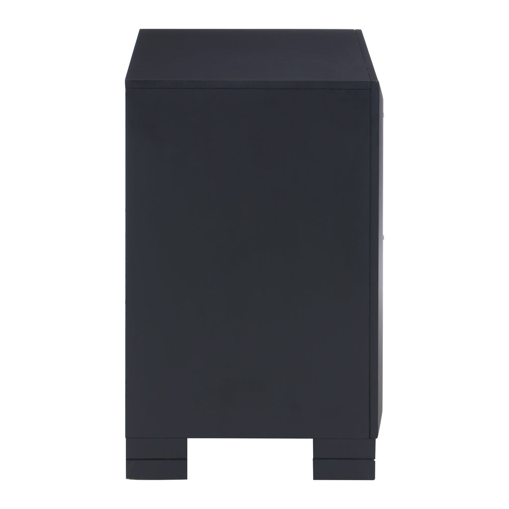 The modern design of the Rosemont Collection creates a striking profile for your bedroom. The midnight blue finish is reflected by the chrome banding that defines the front of the nightstand. Chrome pull hardware accents each of the raised drawer fronts.