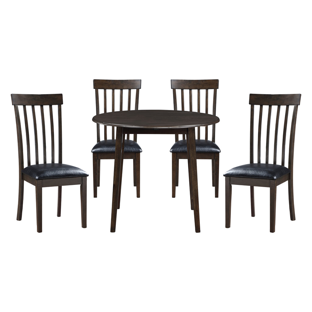 The Rutland Collection has been designed to fit your casual dining room, while taking into consideration the need for flexibility within that space. Convenient to store out of the traffic of your daily routine, the table’s dual drop leaf sides are convenient for smaller scale dining spaces, and when fully extended the table seats four. An espresso finish is utilized over birch veneer for a versatile complement to your tabletop décor. The coordinating chairs feature black faux leather seats, and wood frame chairs. None