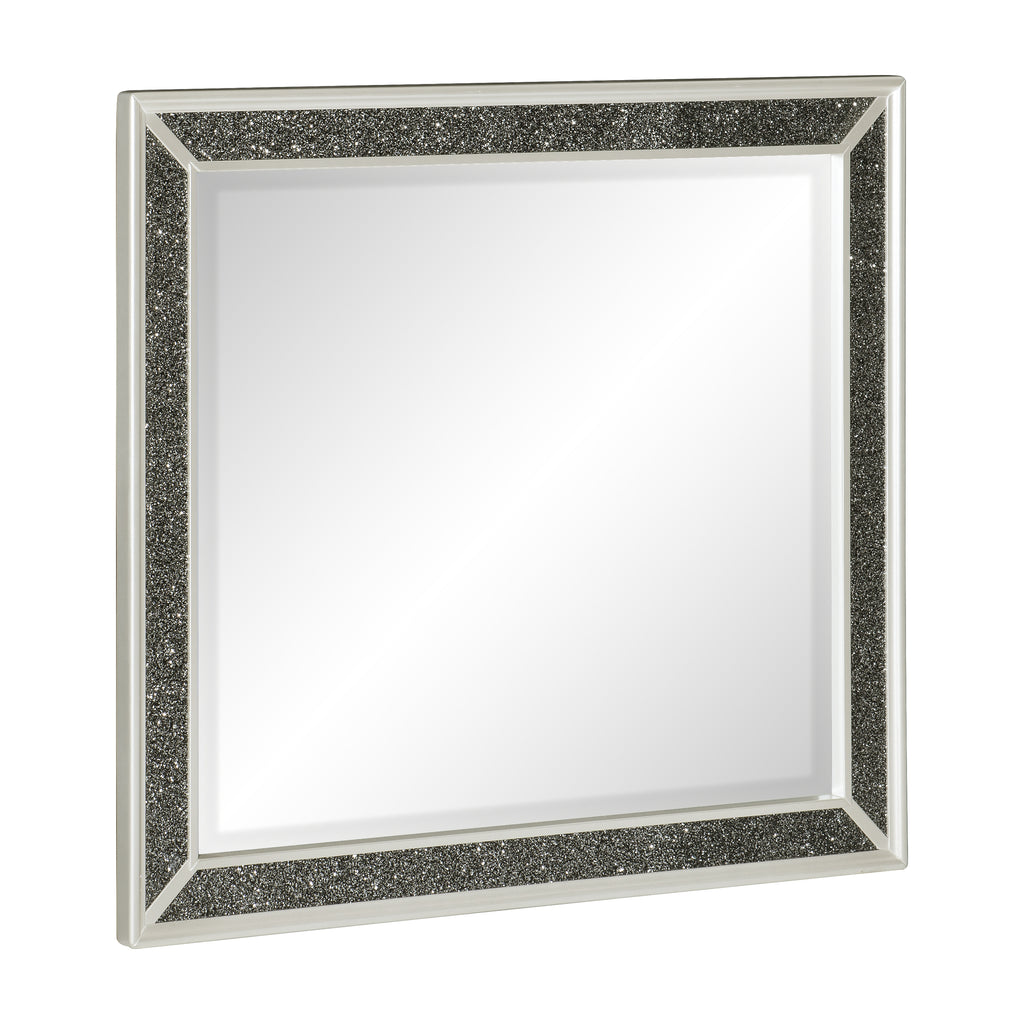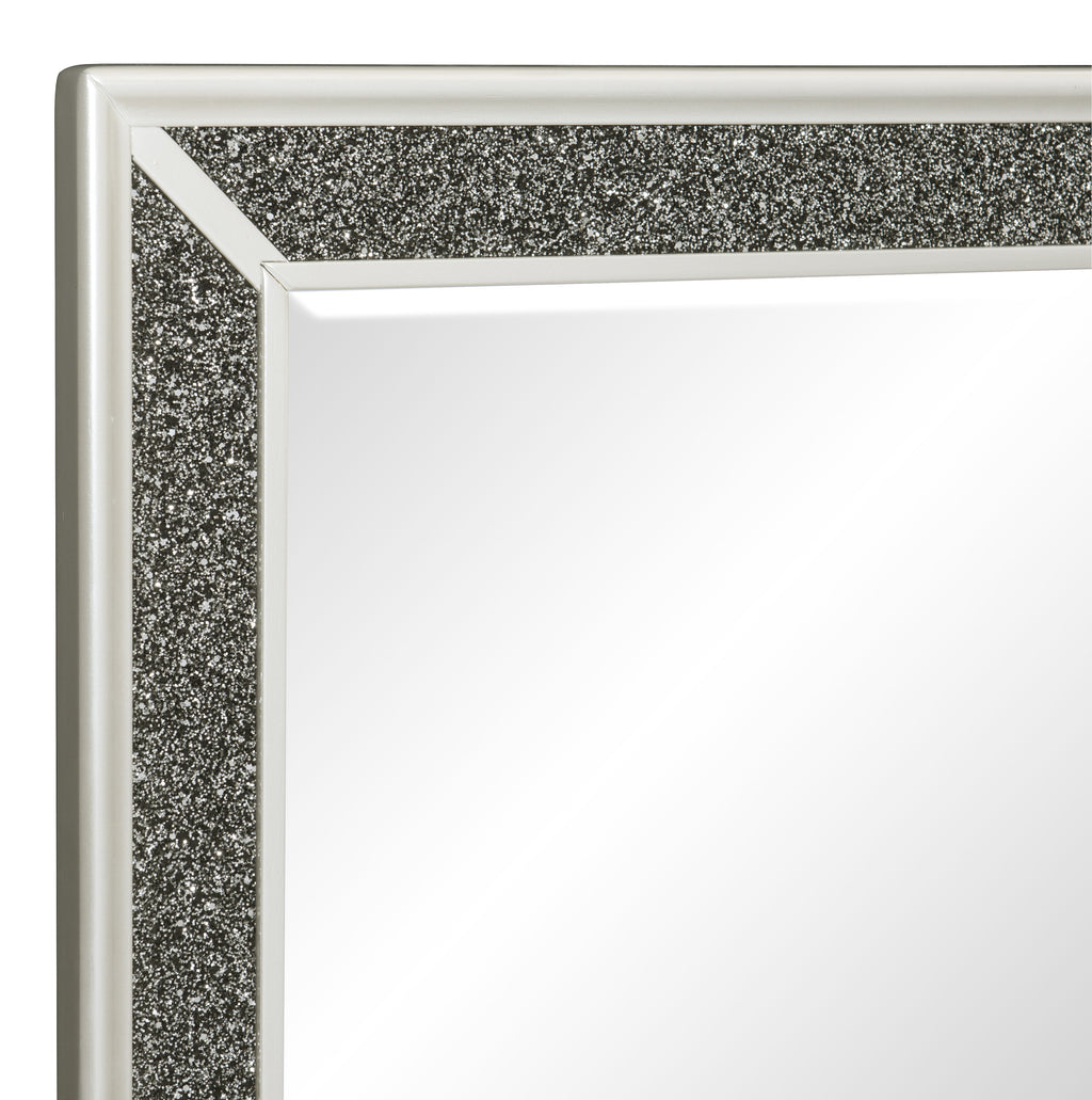 Glamour abounds with the addition of the Salon Collection to your bedroom. The black pearlescent finish is enhanced by the sparkling silver glitter trim that frames the mirror.