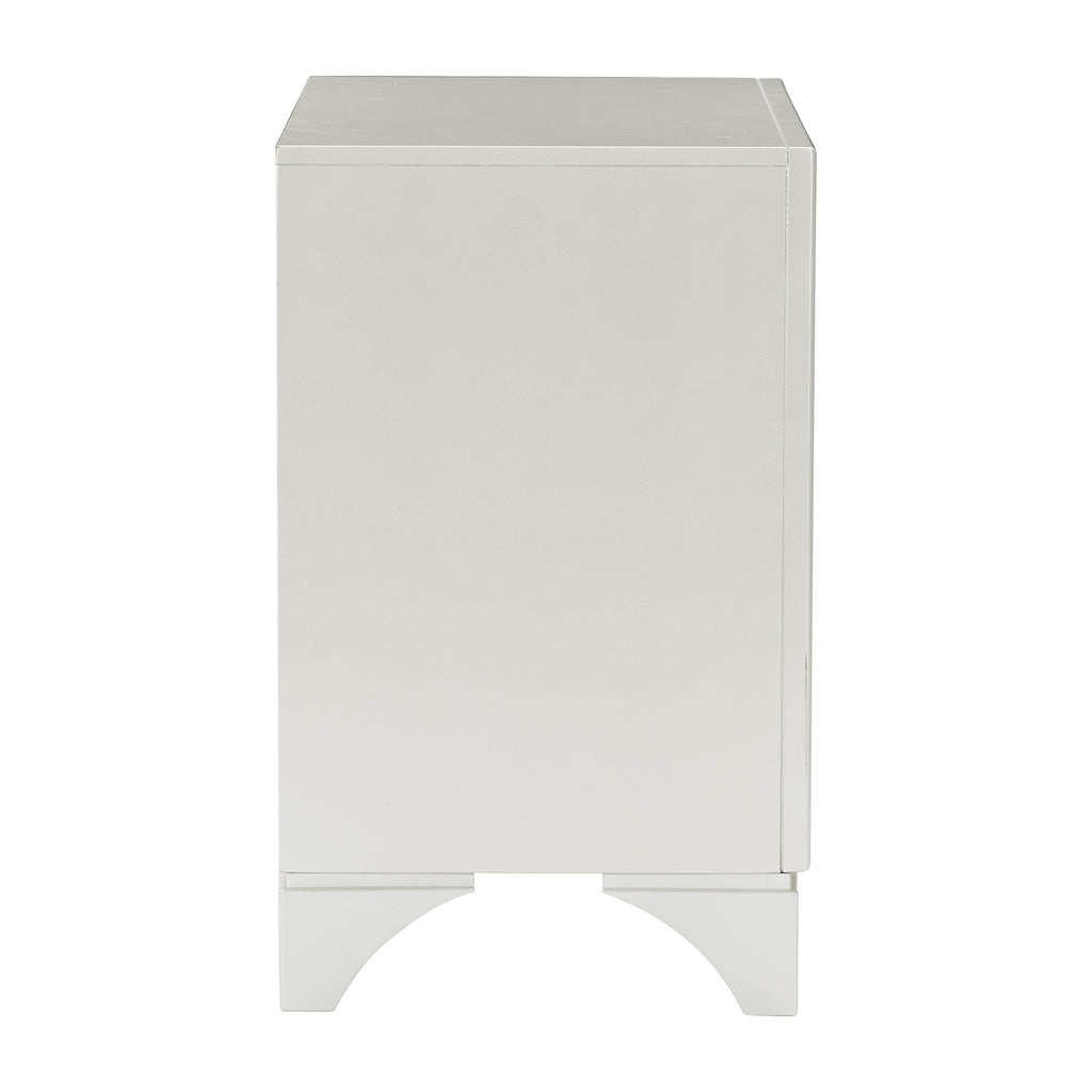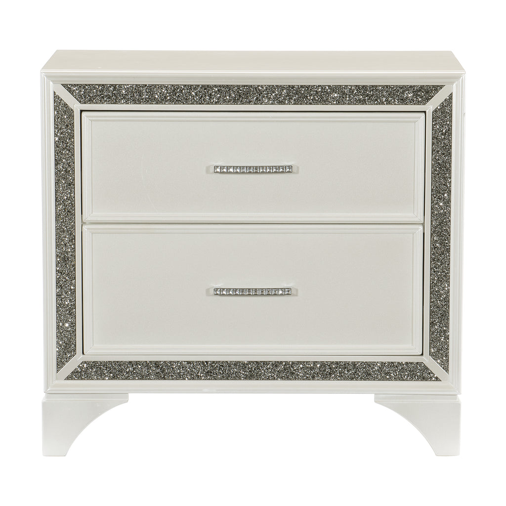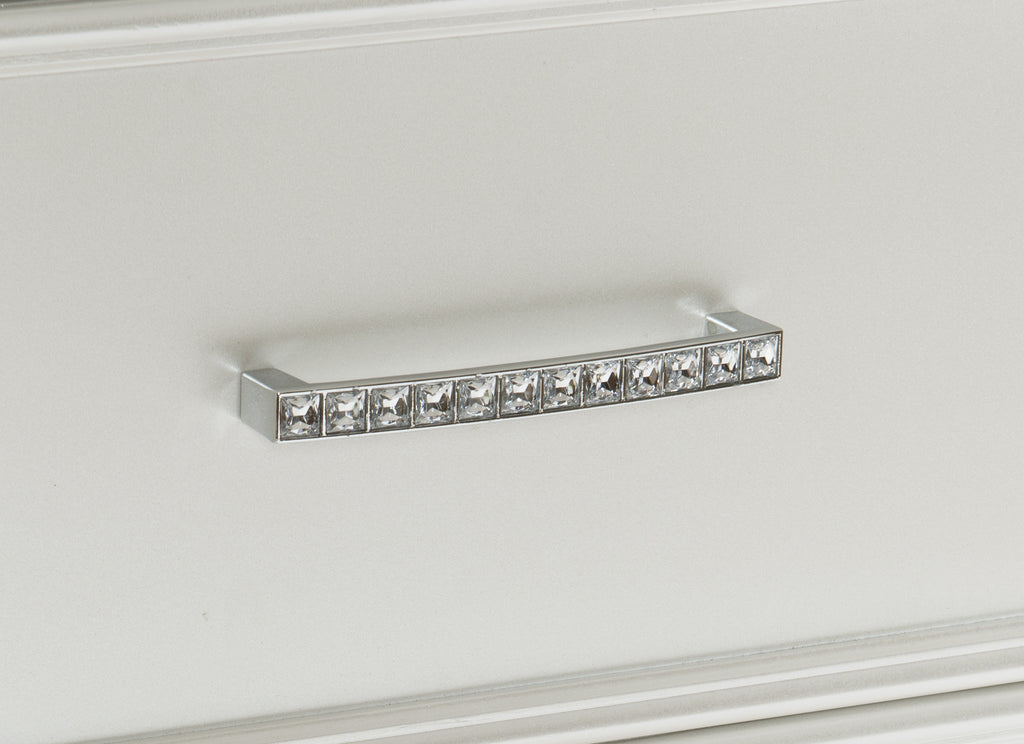 Glamour abounds with the addition of the Salon Collection to your bedroom. The black pearlescent finish is enhanced by the sparkling silver glitter trim that frames the nightstand and the faux-crystal chrome bar hardware pulls that front each drawer.