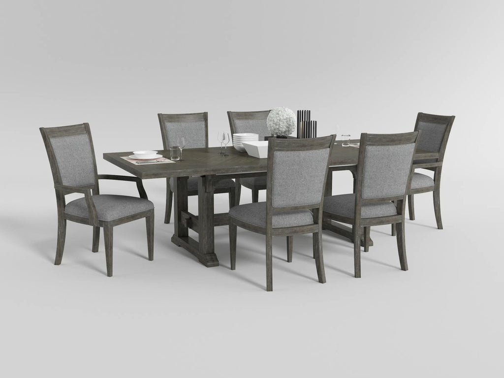 With a style that fits the transitional aesthetic of your home, the Sarasota Collection is sure to become a perfect platform for your mealtime activities. Ash veneer is highlighted with a driftwood brown finish for a wonderfully weathered aesthetic. The wood framed armchair features gray fabric seat and back that lend complementing contrast to the look of the collection.