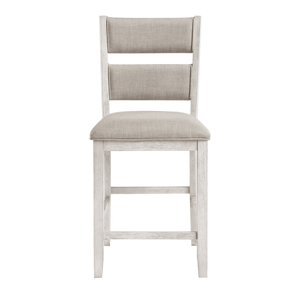 Elevate your casual dining or kitchen island setup with this stylish and comfortable counter height chair, perfect for achieving a modern farmhouse look. Featuring a durable wood frame with a distressed brushed antique white finish, this counter stool is built for stability and designed for maximum organic search appeal in rustic decor. The seat is upholstered in a soft, light gray textured fabric, offering comfortable and easy-to-clean seating. With its sturdy construction and impressive 300lbs weight capacity, this chair combines elevated style with reliable, everyday functionality.