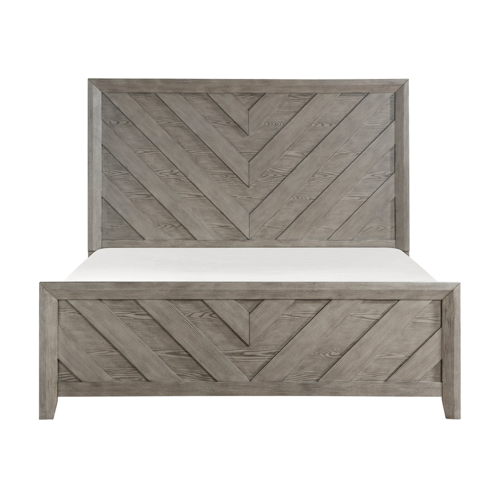 Bring a modern, rustic touch to your bedroom with this Silas Bedroom Collection. Crafted from durable acacia wood and selected hardwoods, the bed features a striking chevron design on the headboard and footboard, adding texture and character to your space. Available in Queen, Eastern King and California King. The sleek gray finish enhances the natural wood grain while the matte black drawer pulls on the coordinating pieces adds an elegant touch to any décor. Coordinating dresser, mirror, nighstand and chest are also available. 63.5 x 86 x 66H