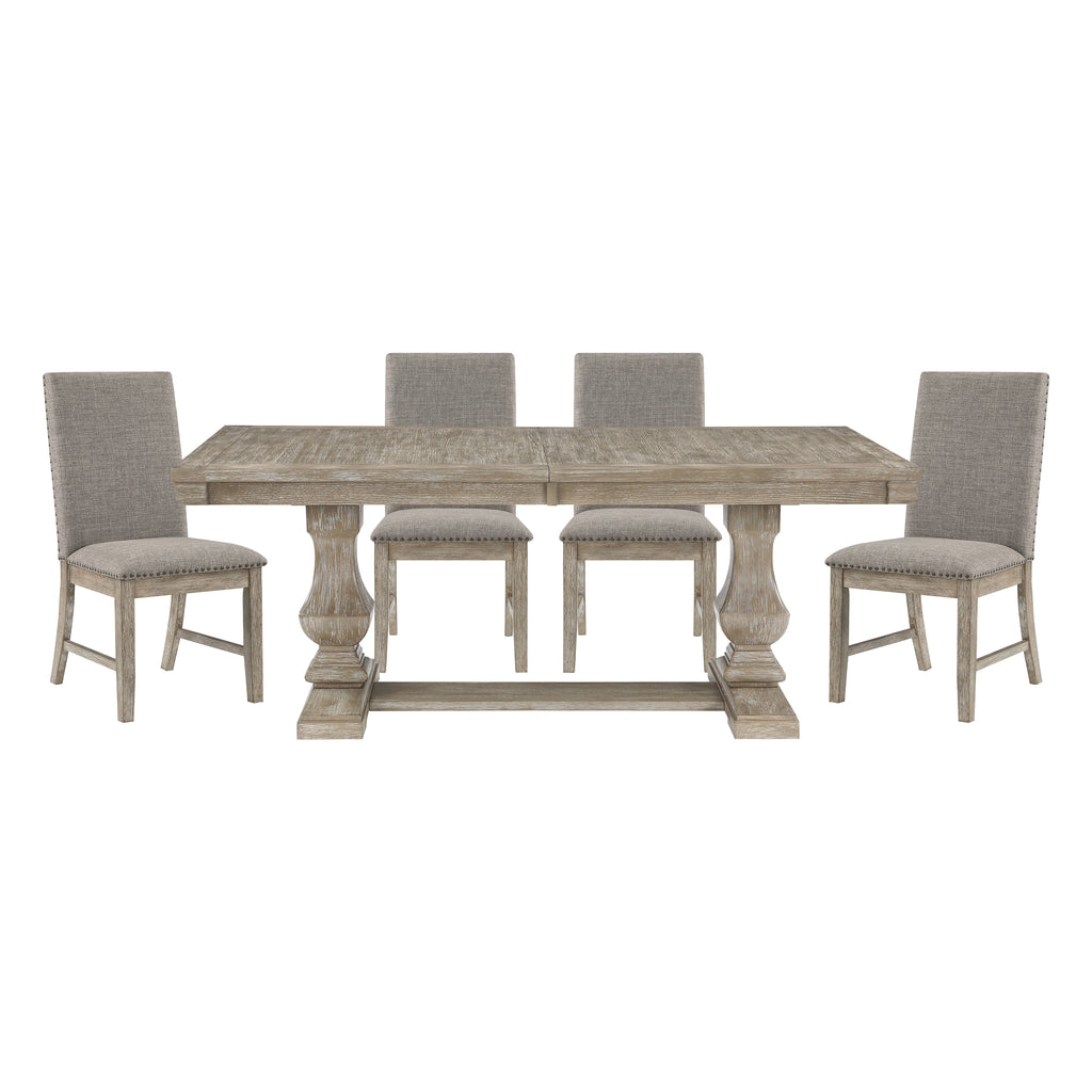 An elegant blend of traditional styling and rustic aesthetic combines to create the look of the Southlake Collection. The rectangular tabletop is supported by a double pedestal base, it’s urn profile lending distinct accent to your dining room. The wire-brushed brownish-gray finish highlights the oak veneer and solid wood construction. The brown linen-covered seats and backs of the side chairs provide complementing contrast to the table. An available bench provides an alternate seating option. The available server provides ample behind door and drawer storage in which to stow your tabletop accessories. The server doors and drawers feature nickel bar and knob hardware. None
