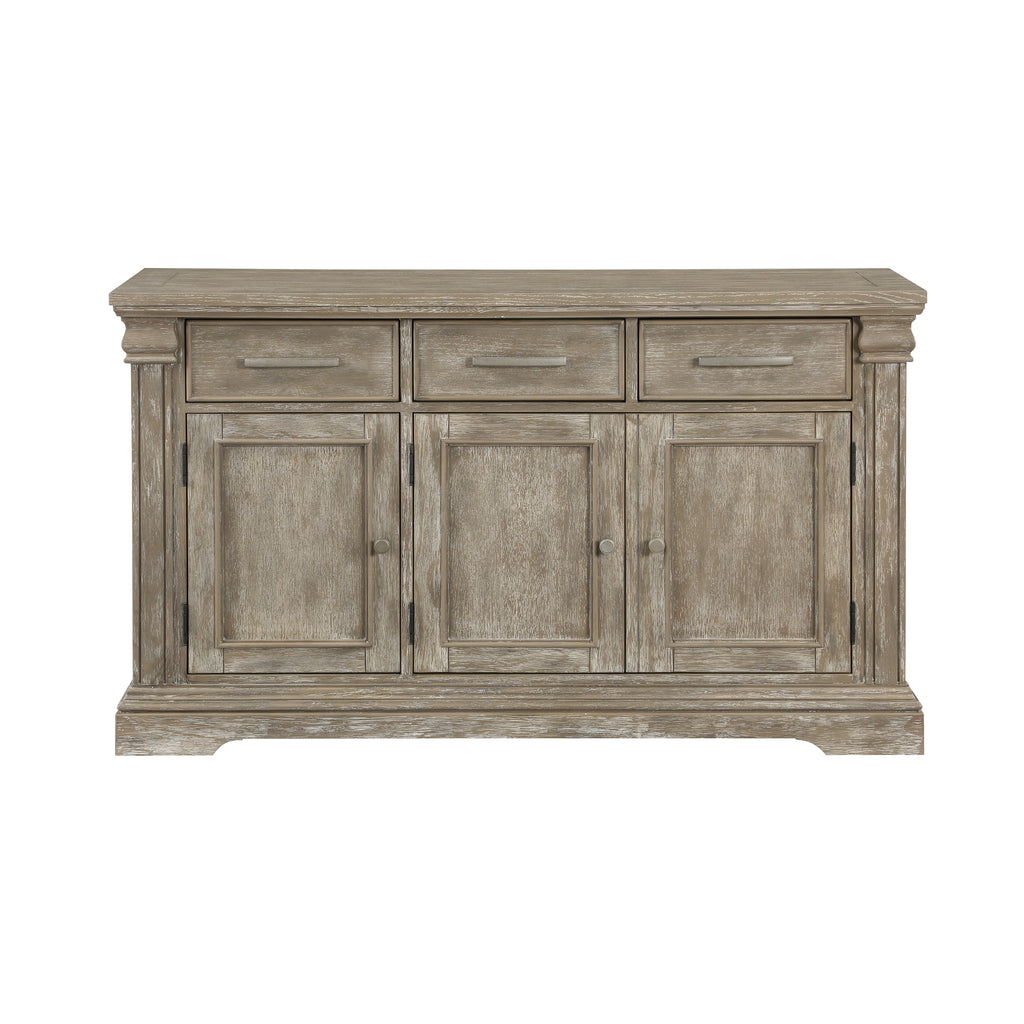 An elegant blend of traditional styling and rustic aesthetic combines to create the look of the Southlake Collection. The wire-brushed brownish-gray finish highlights the oak veneer. The collection features solid wood construction of the server. The server provides ample behind door and drawer storage in which to stow your tabletop accessories. The doors and drawers feature nickel bar and knob hardware. 60 x 18 x 36.5H