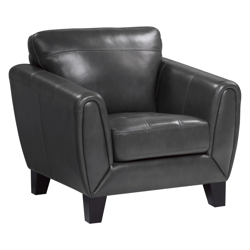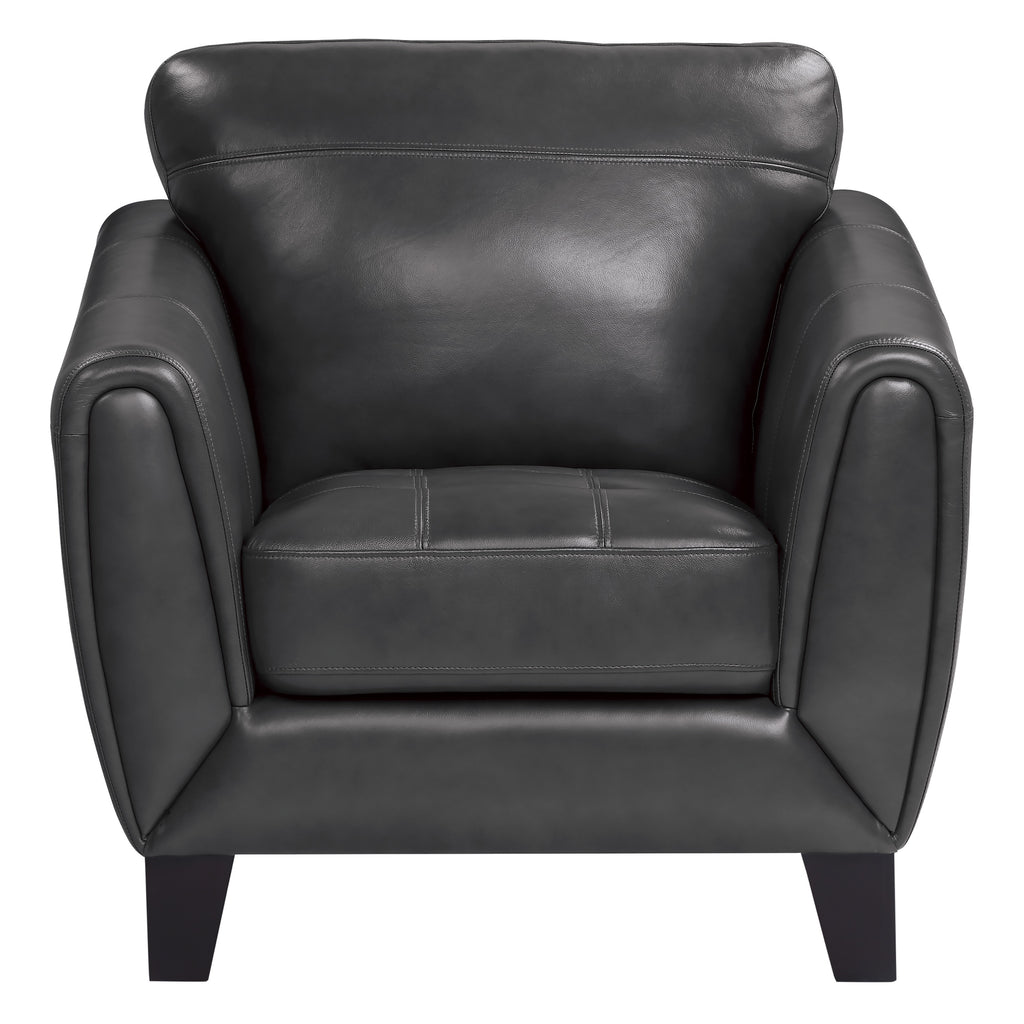 The subtle retro look of the Spivey Collection will pair with modern aesthetic of your home’s décor, creating a classically cool look that is sure to turn heads. The streamlined profile of the chair is covered in an dark gray hued top grain leather. Defining detail comes in the form of the arm’s contour stitching and the cushioned wrap of the chair’s arms. 39 x 37 x 36.5H