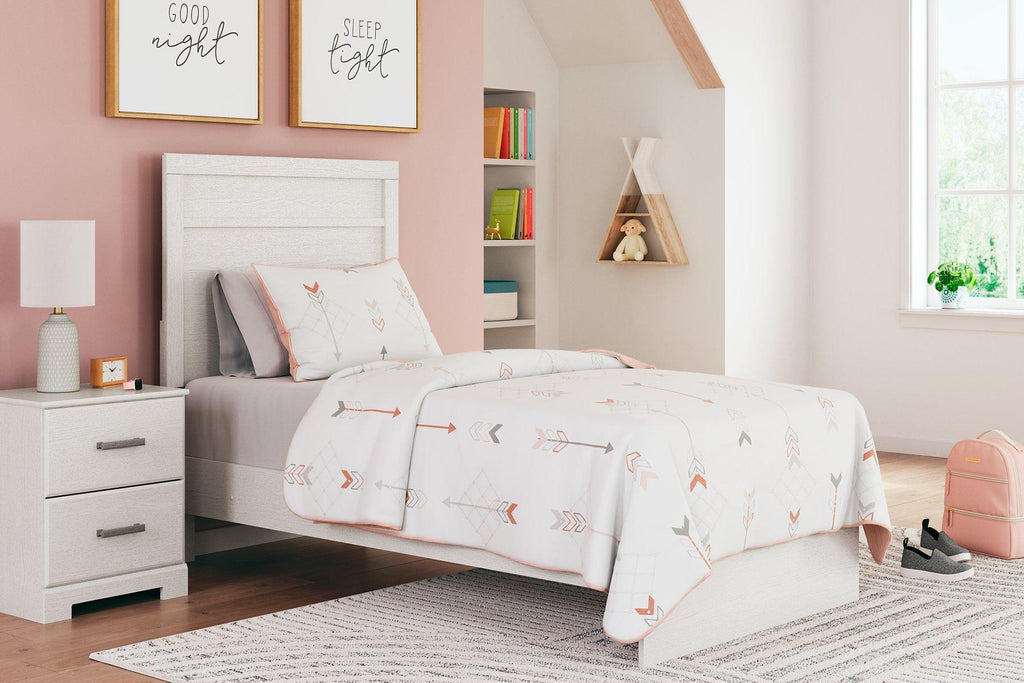 With its clean-lined look and modern attitude, this bedroom package is a fresh style awakening. A crisp, white hue over subtle replicated wood grain easily complements your existing aesthetic. Smooth drawer fronts with antiqued pewter-tone handles complete the look—proof that beauty lies in the details.