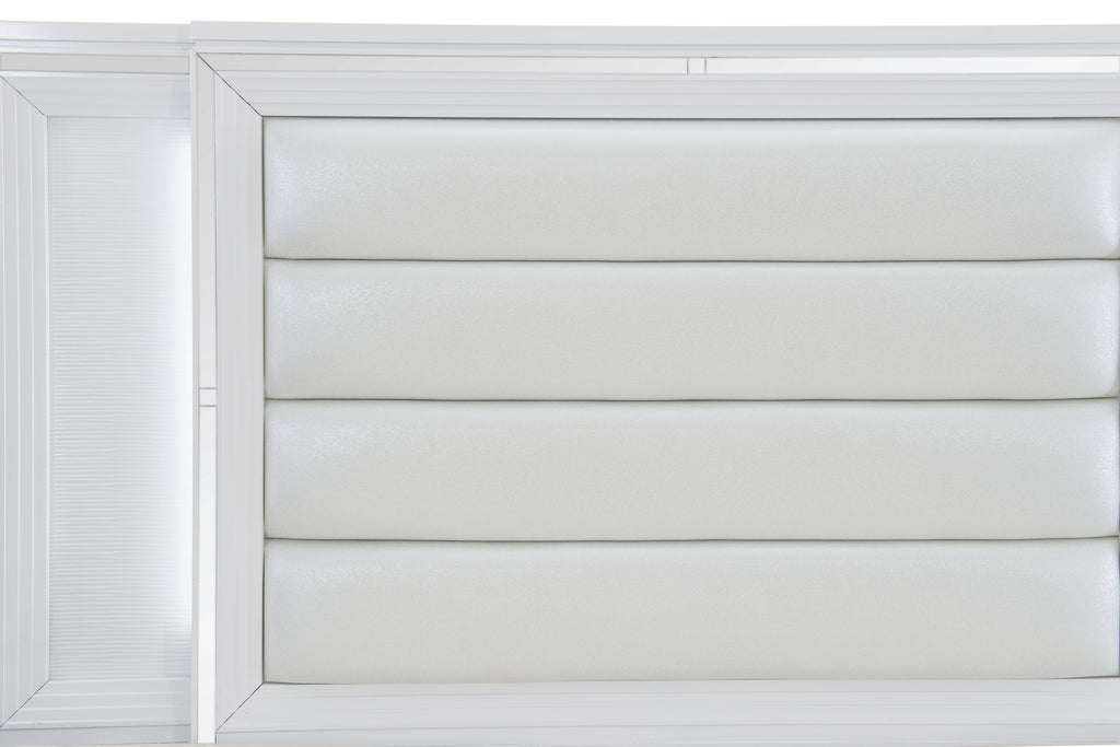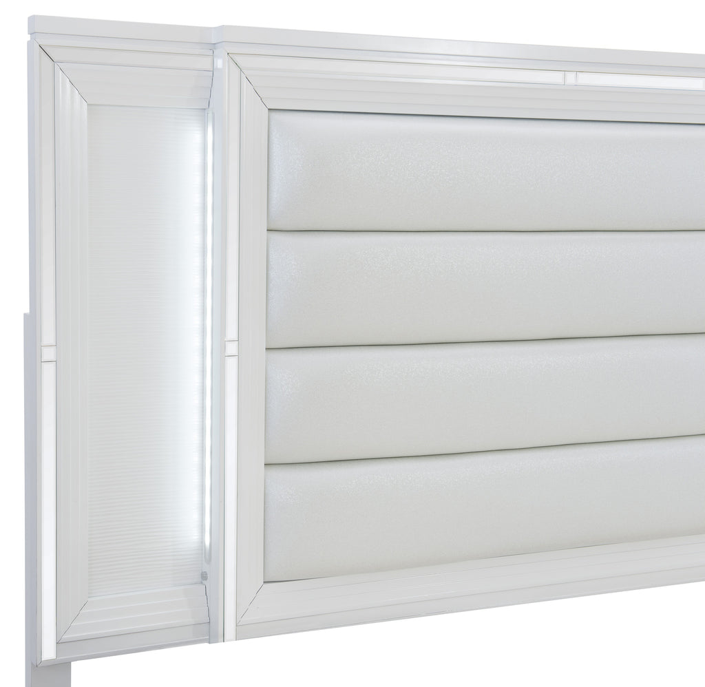 Designed to help your bedroom reach its full glamorous potential, the Tamsin Collection’s unique attributes blend to create a stylish and functional addition to your lifestyle. Mirrored framing provides dramatic enhancement to the Eastern King bed, while LED back-lighting, from the vertical headboard panels, illuminates and highlights the embossed white finish of the collection. Acrylic bar hardware provides unobtrusive decorative touch to the drawer fronts of the storage footboard, with the metallic silver faux leather-covered padded headboard insert lending decorative contrast to the finish of the collection. 78.75 x 85.5 x 68 - 70 - 72H