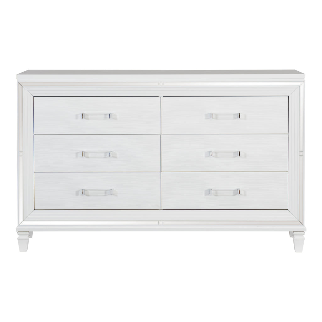 Designed to help your bedroom reach its full glamorous potential, the Tamsin Collection’s unique attributes blend to create a stylish and functional addition to your lifestyle. Mirrored framing provides dramatic enhancement to the dresser, illuminating the white finish. Acrylic hardware provides unobtrusive decorative touch to the drawer fronts of the dresser. Hidden jewelry drawers in the dresser create discrete storage space for your fancy accoutrements.