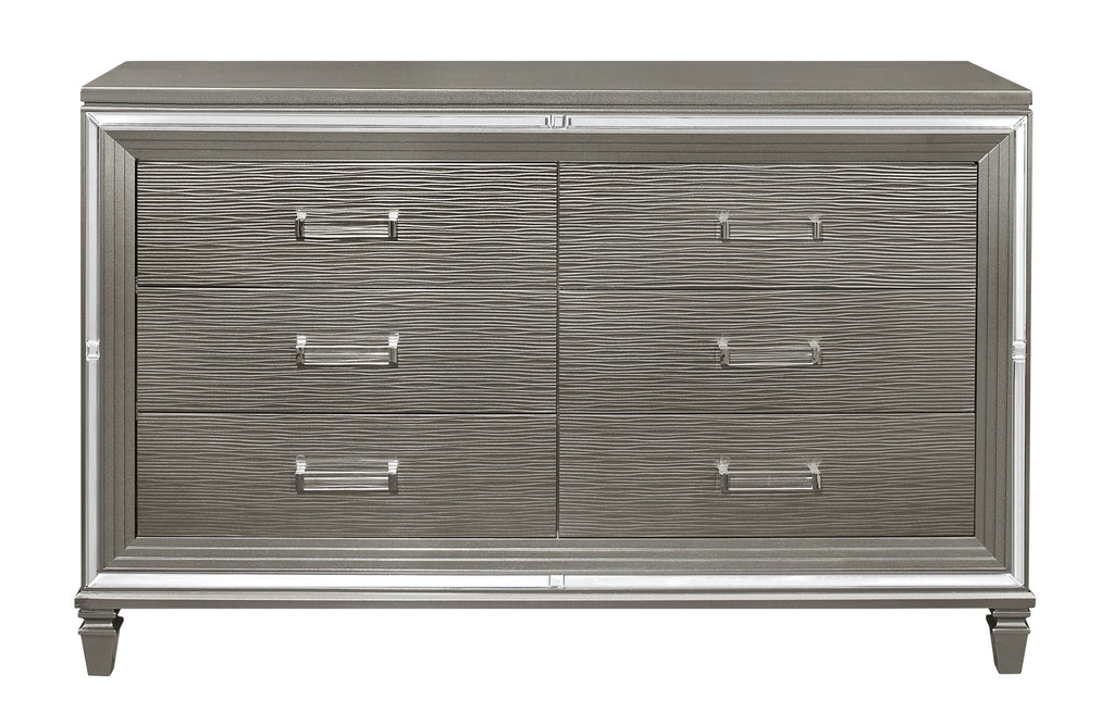 Designed to help your bedroom reach its full glamorous potential, the Tamsin Collection’s unique attributes blend to create a stylish and functional addition to your lifestyle. Mirrored framing provides dramatic enhancement to the dresser, illuminating the silver-gray finish. Acrylic hardware provides unobtrusive decorative touch to the drawer fronts of the dresser. Hidden jewelry drawers in the dresser create discrete storage space for your fancy accoutrements.