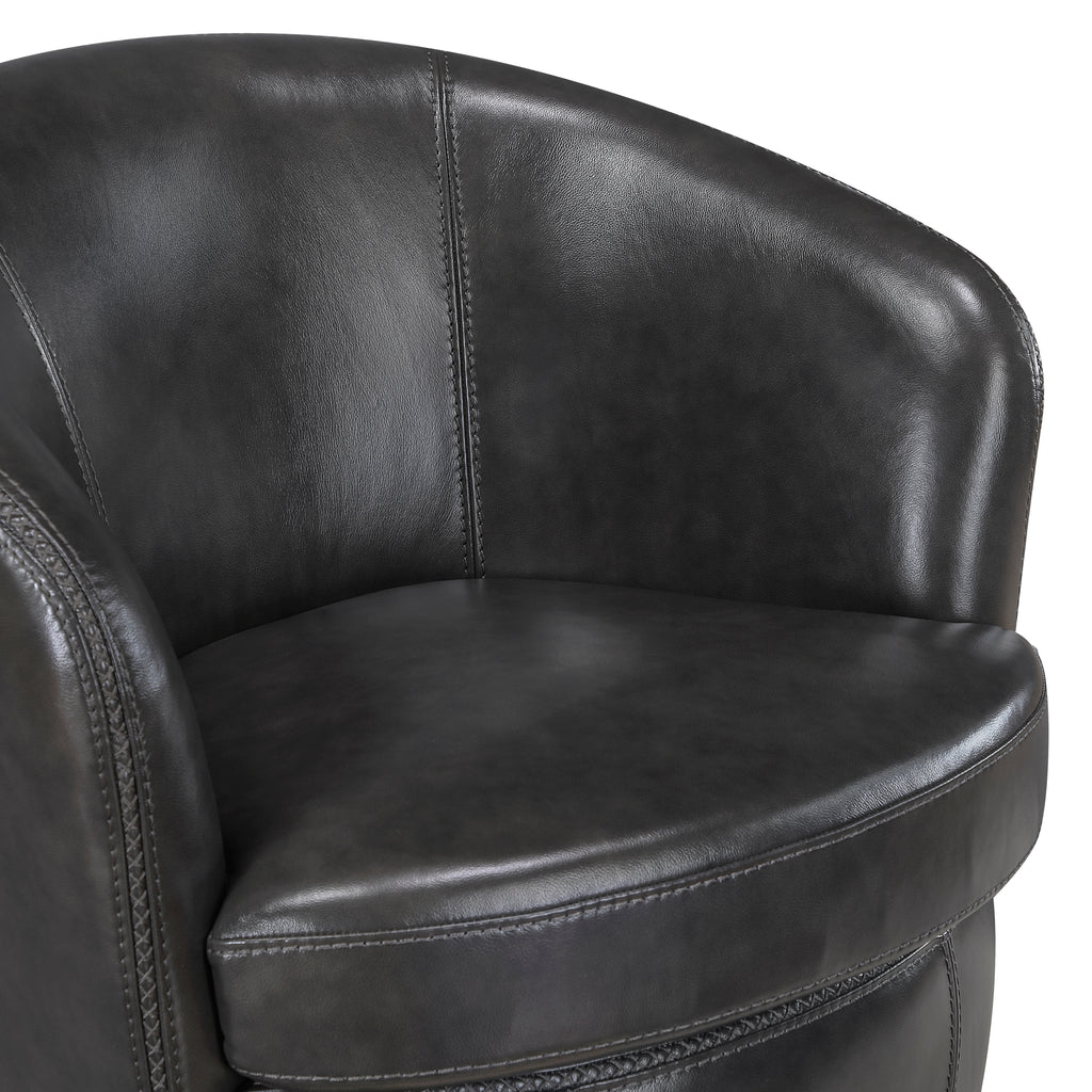 Experience the epitome of luxury and functionality with this top grain leather swivel barrel chair. Featuring a sturdy solid wood and plywood frame with a smooth metal swivel base, this chair offers both durability and effortless movement. The dacron wrapped high-density foam cushions provide exceptional comfort, while the 100% top grain leather upholstery adds a touch of timeless elegance. The removable seat cushion cover with zipper makes cleaning and maintenance a breeze. With a 360-degree swivel and no assembly required, this chair is perfect for enhancing your living room, office, or reading nook with a blend of style and practicality.