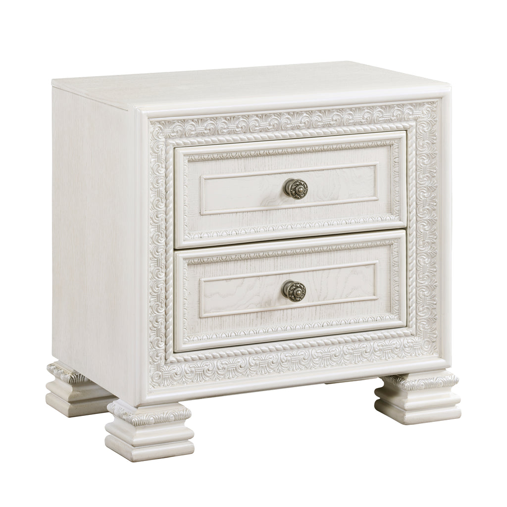 Modern Classicism is defined in the elegant presentation of the Theodora Collection. The treasured themes of old-world accenting – egg and dart molding, acanthus detailing, rope molding, detailed knob hardware – front the nightstand, the timeless style enhanced by the modern pearl white finish over the collection’s ash veneer.