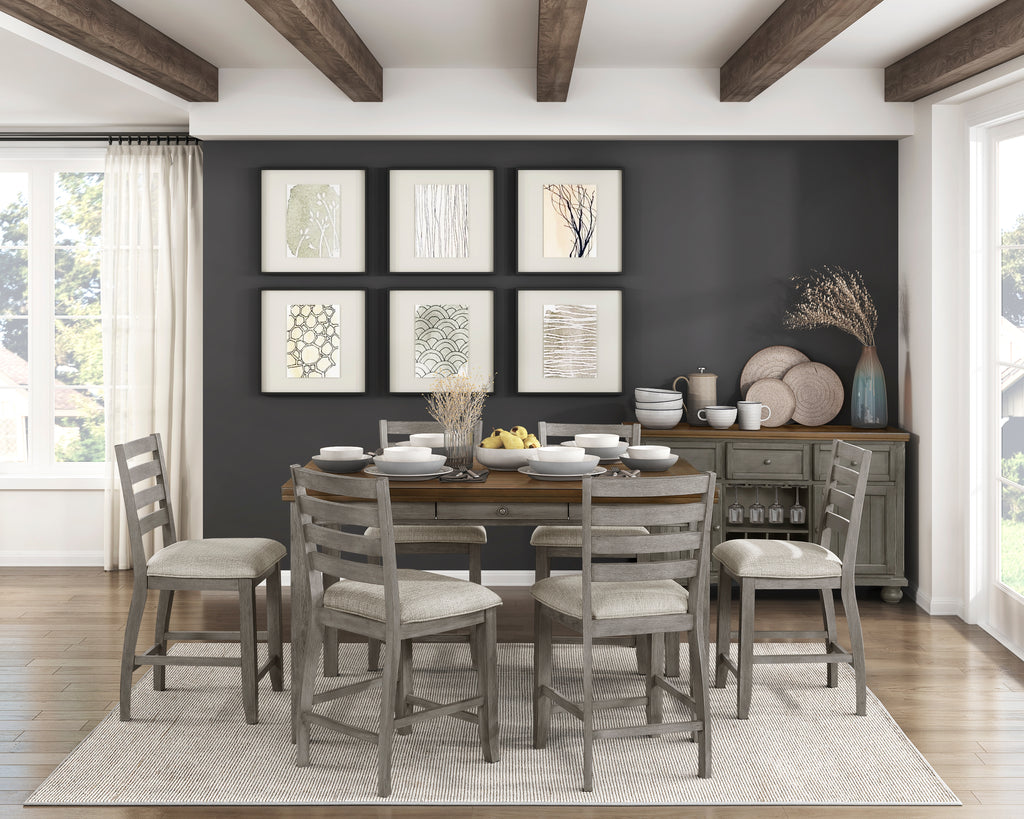The traditional styling of the Tigard Collection lends timeless appeal to the look of your casual dining space. With subtle hints nodding to the Arts and Crafts design movement, the ladder-back counter height chair features classic lines that solidify the versatile aesthetic of the collection. Covering the padded seats of the chair is a neutral tone fabric upholstery, complementing the traditional cherry finish of the chair’s wood veneer.