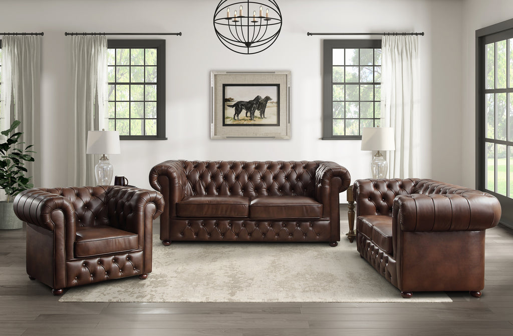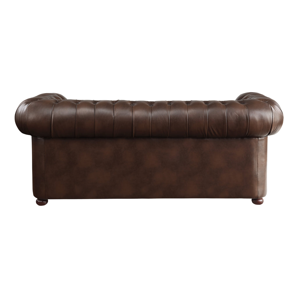 With a look that would be at home in the poshest of lounges, the Tiverton’s traditional design and classic accenting will be a grand addition to your classically styled living room. The Chesterfield-style sofa is offered in brown breathable faux leather upholstery and features the classic accenting of button tufting, defining welt and heavily rolled arms. 82.5 x 36.5 x 33H