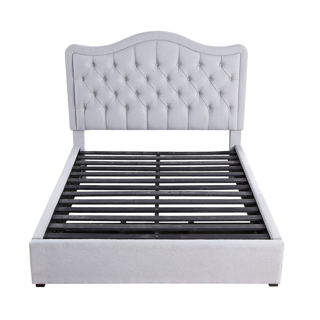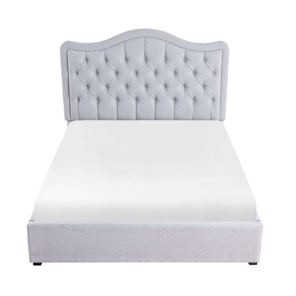 The distinct camelback headboard of the Toddrick Collection provides an elegant focal point for your bedroom. With styling that lends to placement in modern traditional environments, the Eastern King upholstered bed’s profile is defined by nailhead trim, features button-tufting and is covered in gray linen-like fabric for neutral accent to your bedroom’s decor. The platform bed’s low-profile footboard conveniently pulls out to reveal a storage drawer, providing functional space to store your essentials. 85 x 87 x 60H