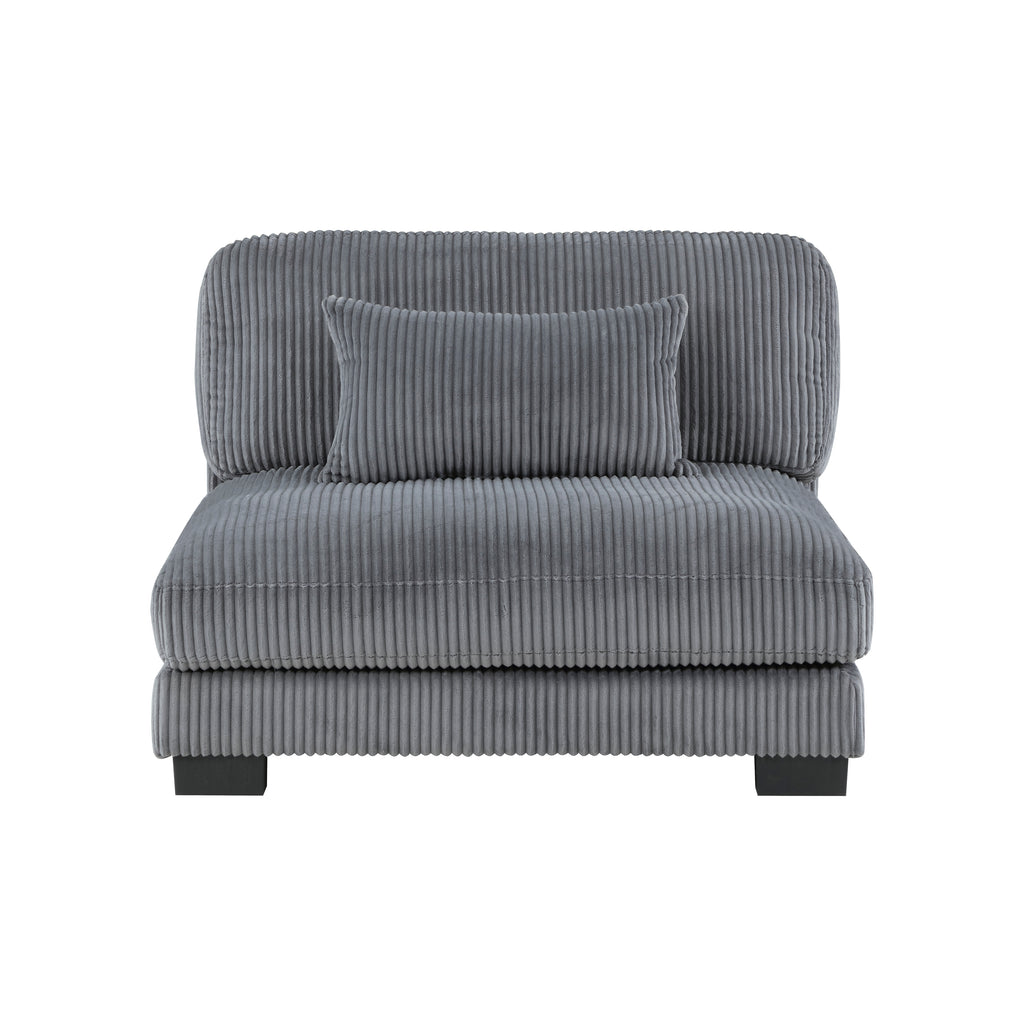 Configurable to your available space, the Traverse Collection allows for the addition and detachment of pieces for a customized seating experience. The 6-piece sectional configuration consists of two corner units paired with three armless chairs, and an ottoman. The gray corduroy fabric upholstery creates a plush expanse for a soft touch experience. The corner seat features two toss pillows, adjustable back and arm rest, and reversible cushions. The armless chair features a lumbar pillow, and reversible cushions. 135 x 135 x 34.5H