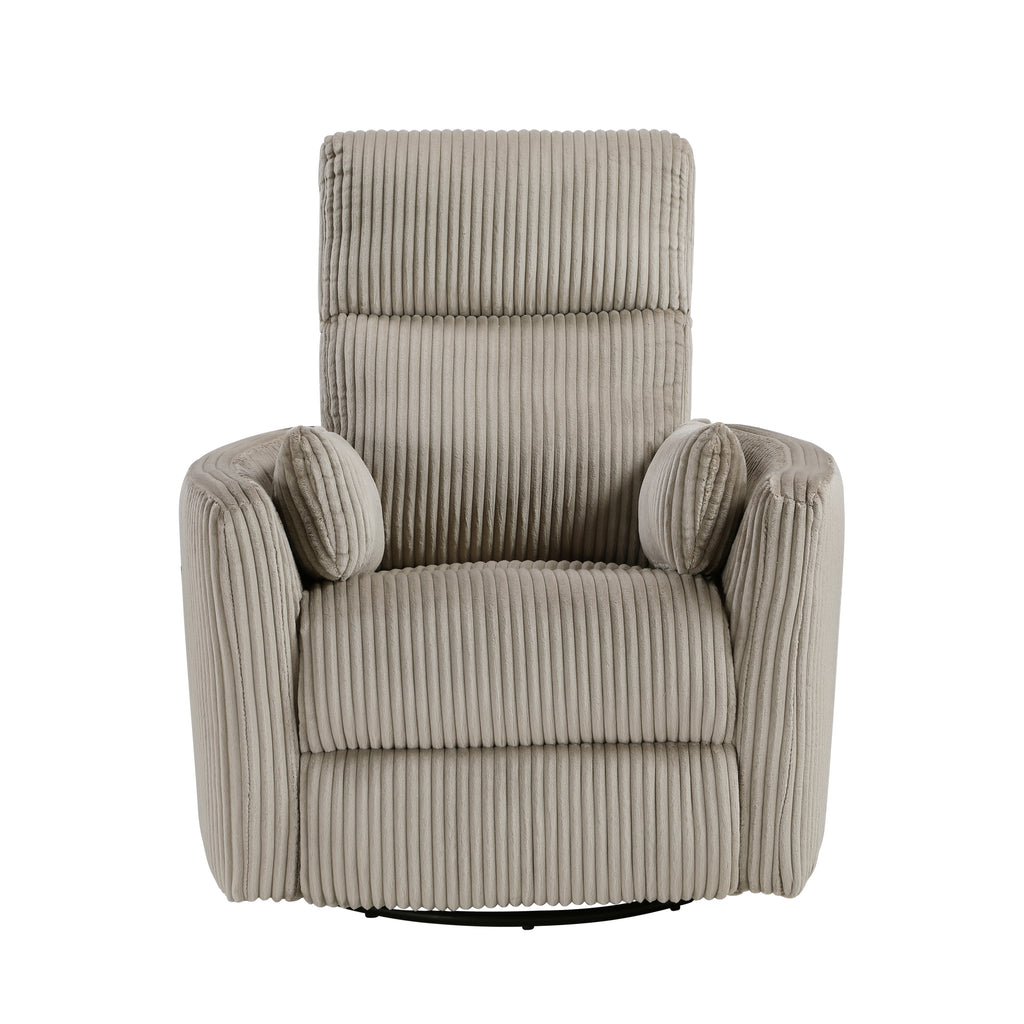 Enjoy the ultimate comfort with this swivel glider reclining chair, a perfect blend of style, functionality, and relaxation. Upholstered in soft, textured corduroy fabric, this recliner offers a cozy seating experience while adding a touch of modern sophistication to any room. The chair features a 360-degree swivel, gentle gliding motion, and an easy-to-use reclining function, making it ideal for living rooms, bedrooms, or any space where relaxation is a priority. Designed for both style and comfort, this chair combines plush cushioning with smooth reclining mechanisms, allowing you to fully recline and relax. The beige color and corduroy fabric texture make it a versatile choice that complements a variety of decor styles.