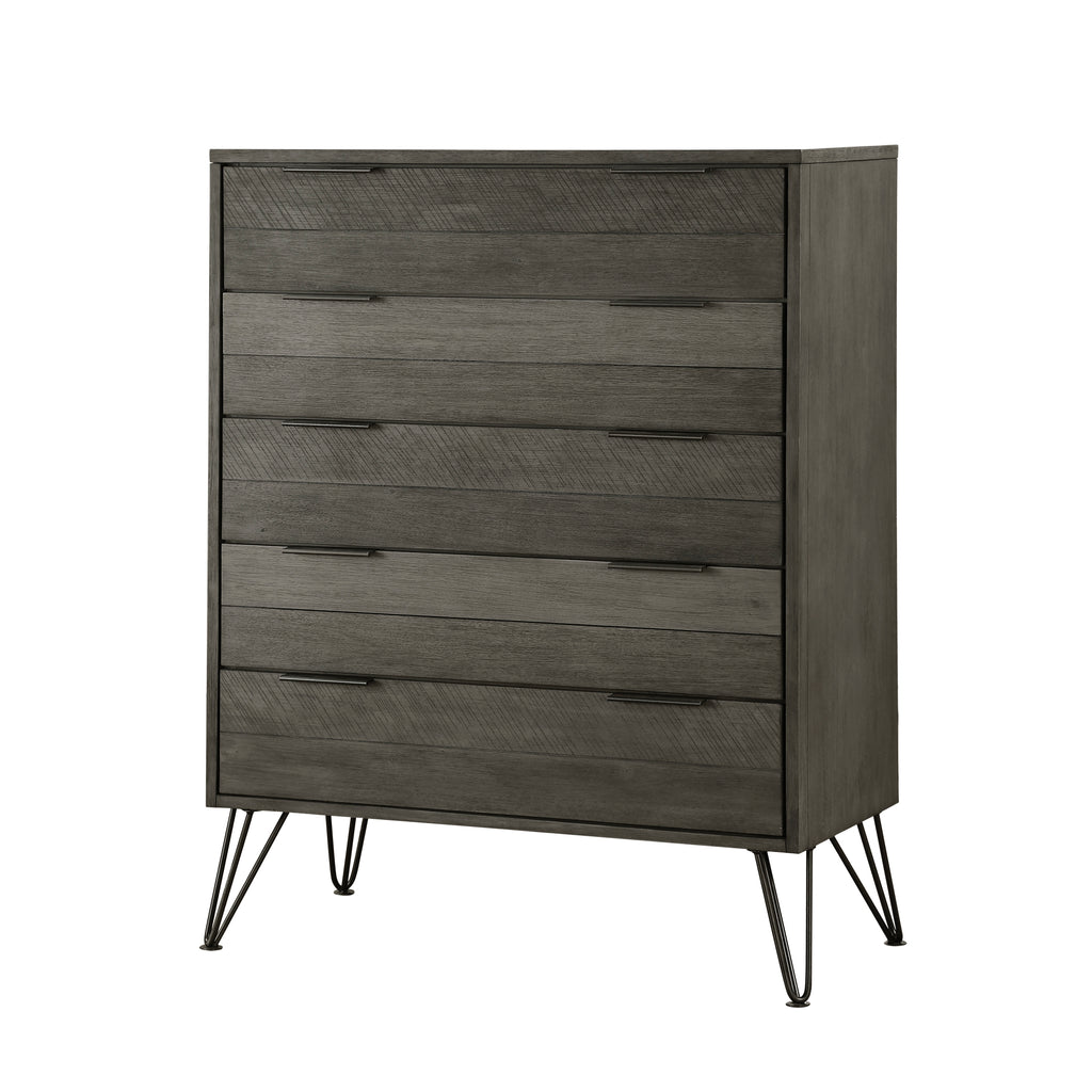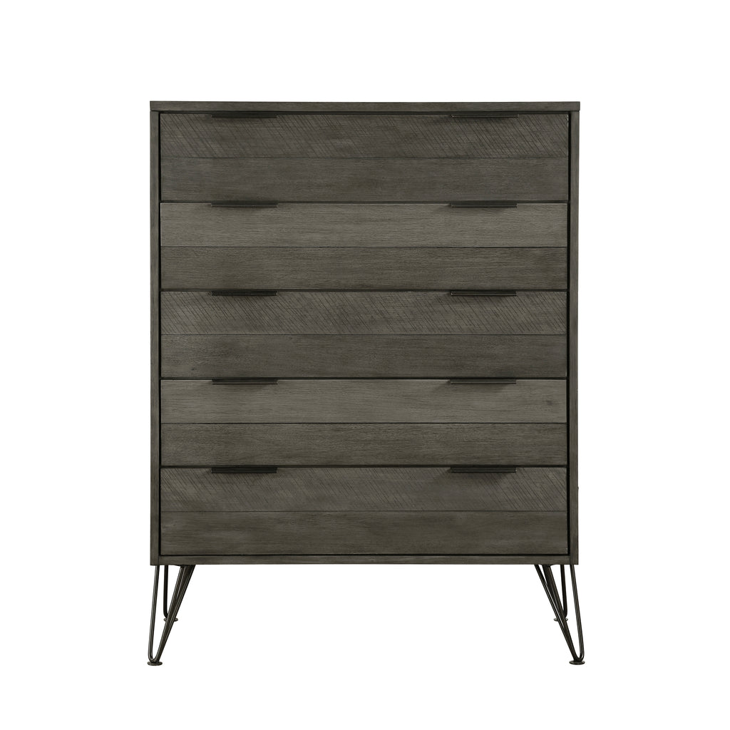 Perched atop metal legs, creating a dramatic statement of contemporary styling, the Urbanite Collection is a perfect reflection of your modern style preference. The chest’s solid acacia wood with acacia veneer is highlighted by a 3-tone grey finish that allows the variance of the natural grain to shine. The horizontal slat design, five-drawer configuration and metal pull tab hardware lend to the clean, contemporary look.