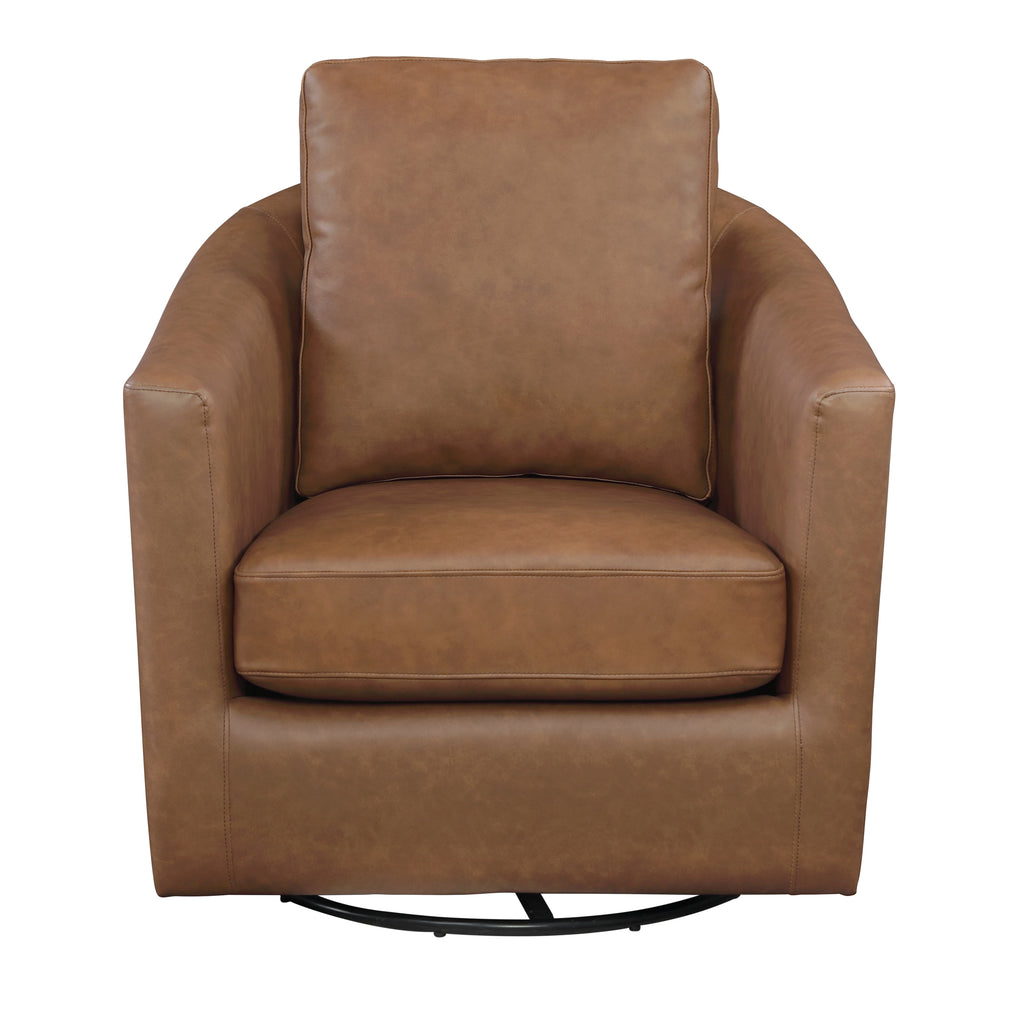 Experience comfort and style with this elegant swivel chair, available in camel, dark brown, or black. It is upholstered in premium top grain leather where your body touches, complemented by high-quality faux leather elsewhere. The leather offers a soft feel that develops rich character over time. A smooth 360-degree swivel provides effortless movement, blending timeless style with modern functionality for any room.