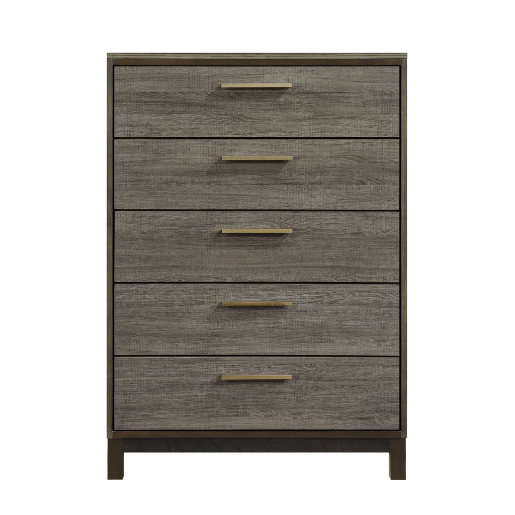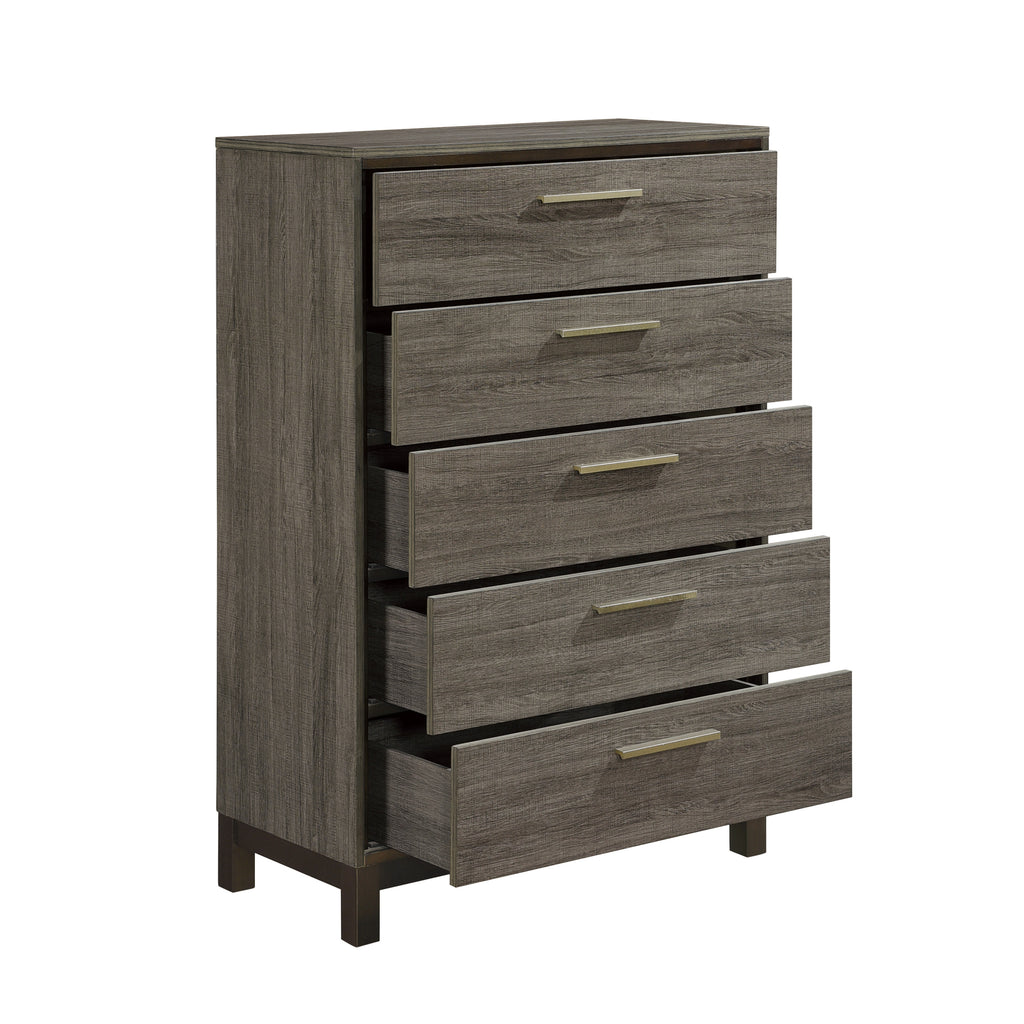 The contemporary styling of the Vestavia Collection provides a unique platform from which to redecorate your bedroom. Faux wood printed veneer provides subtle texture and a gray finish perfectly contrast the dark brown base rail of the chest. Clean lines lend to the angular modern look and are enhanced by the antique brass tone bar pulls. 33.5 x 15.5 x 48H