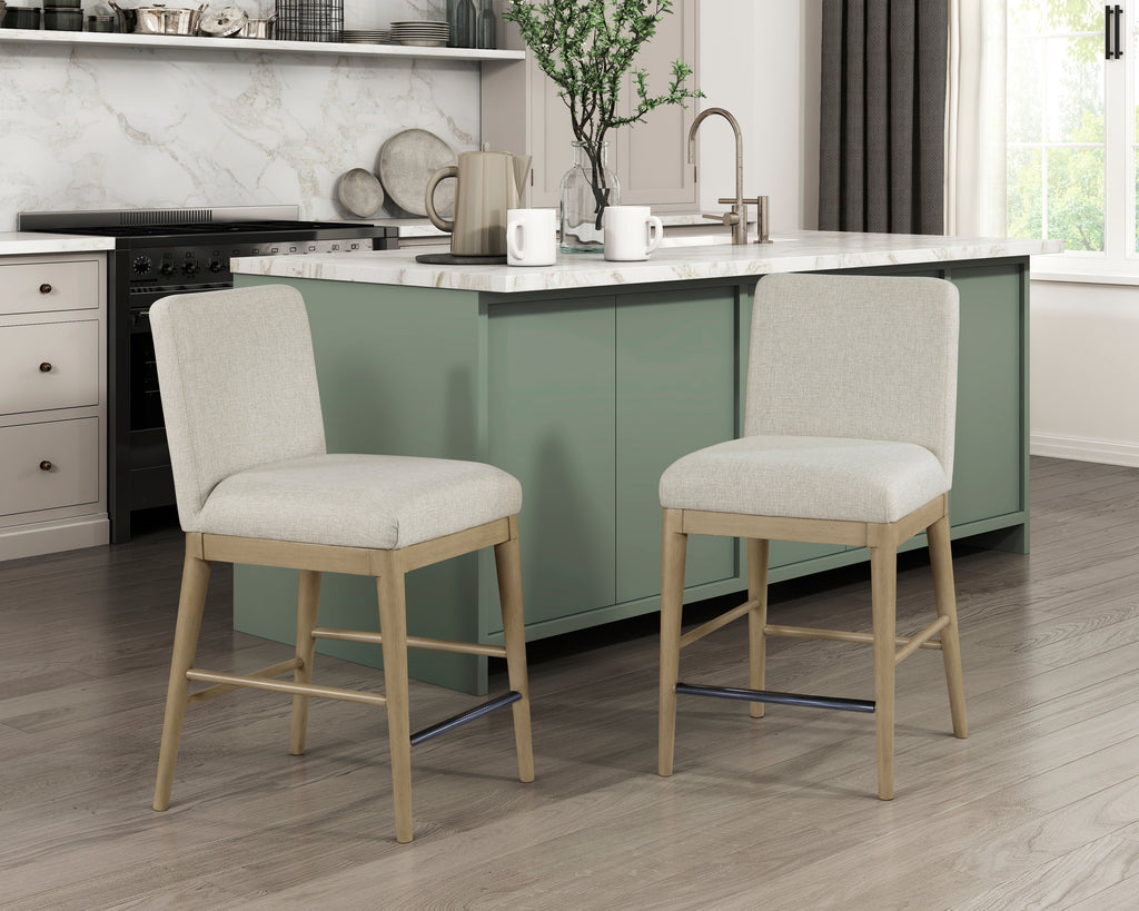 Designed for your home’s casual dining space is the Warner Collection. This counter-height chair features a metal footrest, sturdy solid wood construction, modern profile, natural finish, and a gray textured fabric upholstered seat and back.