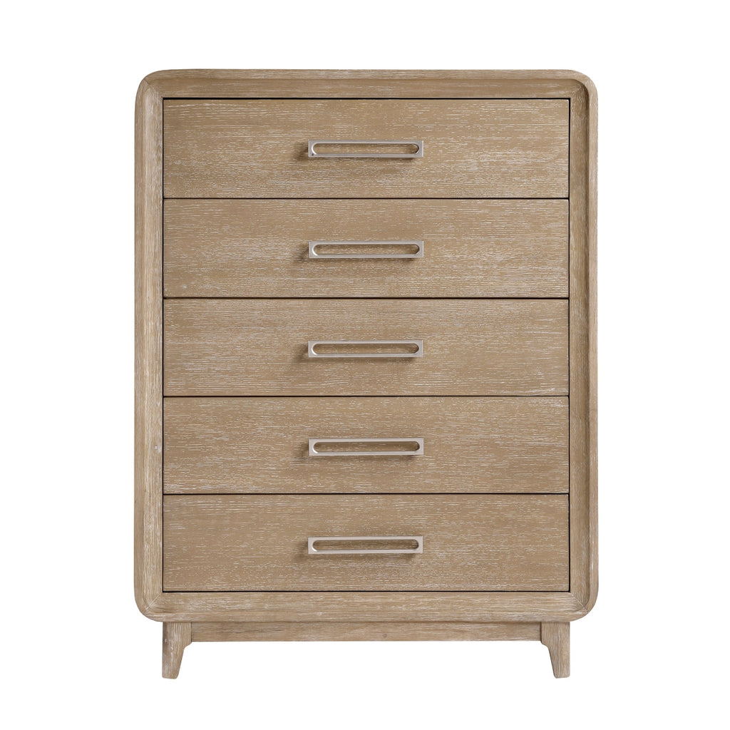 Elevate your bedroom's storage and style with the 5-drawer chest. This beautifully crafted chest, featuring a timeless natural finish on durable oak veneer, wood, and engineered wood, offers ample space to organize your essentials. The five smoothly operating dovetail drawers, equipped with full-extension ball-bearing glides, provide effortless access to your belongings, while the elegant antique nickel-tone bar pulls add a touch of sophisticated charm. Designed for both functionality and enduring aesthetic appeal, this chest is a perfect addition to any transitional or rustic-inspired interior.