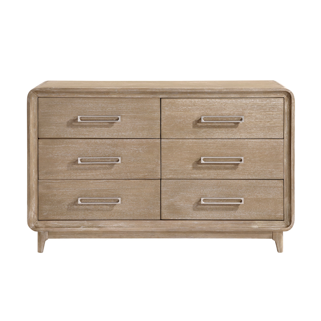 This elegant 6-drawer dresser offers expansive storage and refined style, making it a sophisticated and practical addition to any bedroom. Expertly crafted from a blend of durable oak veneer, solid wood, and engineered wood, this dresser ensures exceptional stability and longevity. The beautiful natural finish highlights the wood's inherent grain, creating a calming and versatile aesthetic that seamlessly blends with various interior décors. Featuring six spacious drawers, each constructed with sturdy dovetail joints and equipped with smooth ball-bearing glides, organizing your clothing and accessories has never been easier or more efficient. The refined antique nickel-tone bar pulls provide a touch of classic sophistication, elevating the overall design of this truly functional and elegant piece.