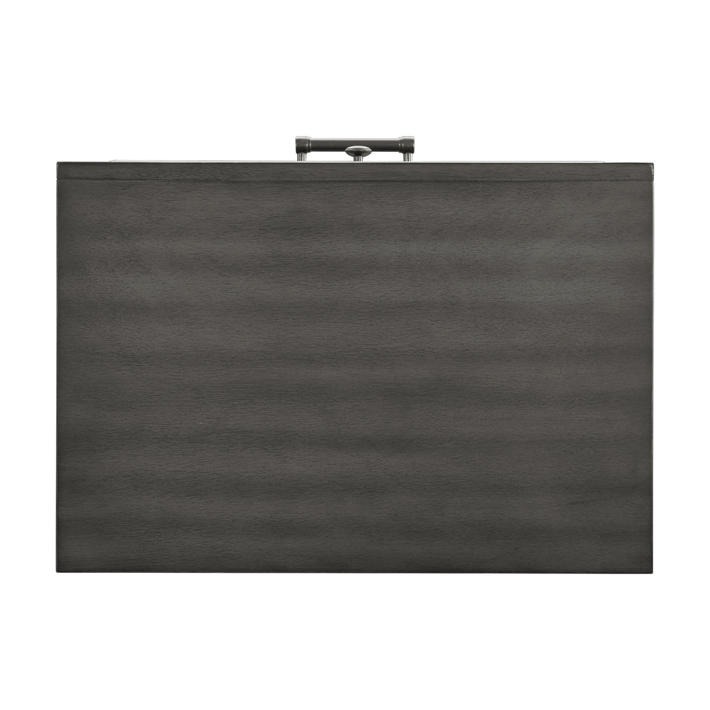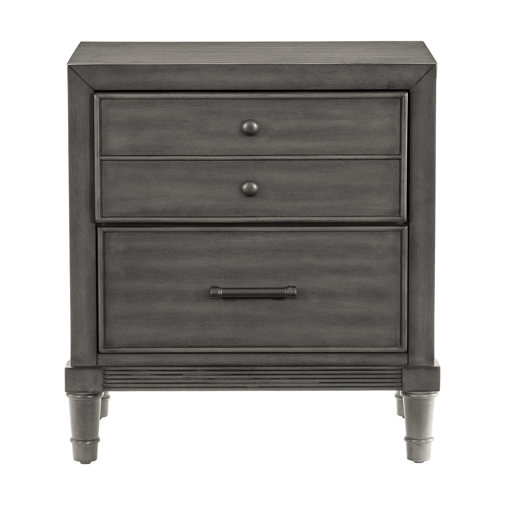 Modern convenience is paired with transitional style to create the versatile look of the Wittenberry Collection. The nightstand’s gray finish over okume veneer is complemented by the dark bronze finished knob and bar hardware that fronts the framed drawers of the piece.